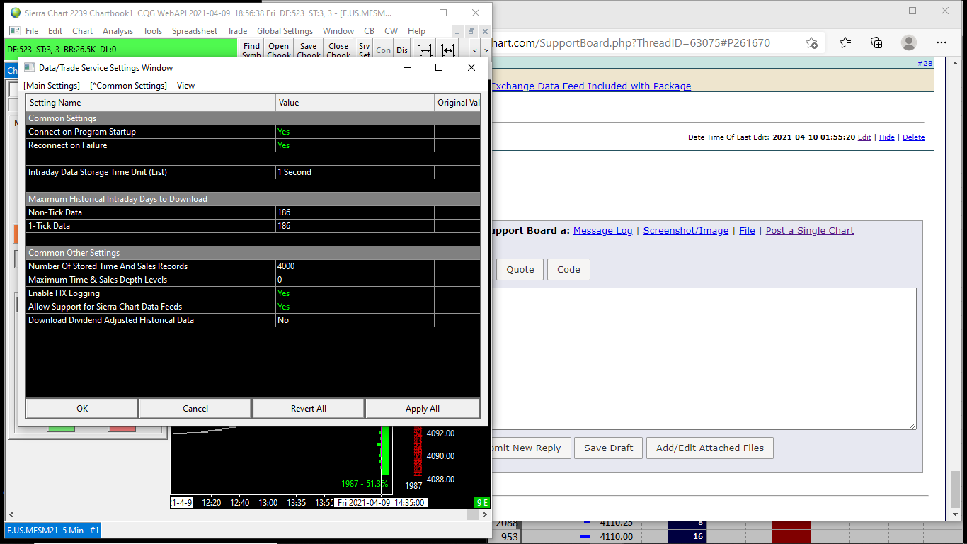 Then please do the following: - Again, make sure you have the active chart as the one that has the market depth issue. - Select Chart >> Chart Settings - Select the tab for Advanced Settings 3 - Under "Maximum Market Depth Levels" (toward the bottom of the page), let us know if this is set to 100. If so, change it to 0 and this will solve your problem. For the most reliable, advanced, and zero cost futures order routing, use the Teton service: Sierra Chart Teton Futures Order Routing |