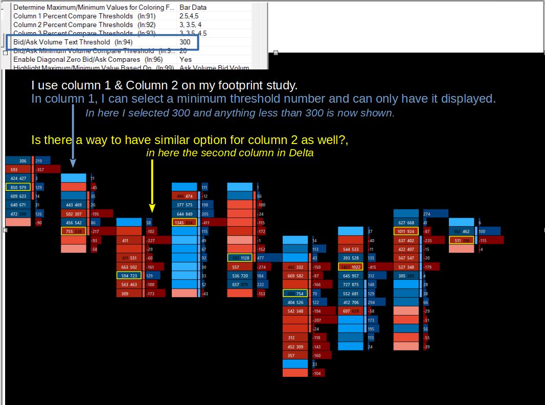 Hello, I use column 1 & Column 2 on my footprint study. In column 1, I can select a minimum threshold number and can only have it displayed. In here I selected 300 and anything less than 300 is now shown. Is there a way to have similar option for column 2 as well?, in here the second column in Delta |