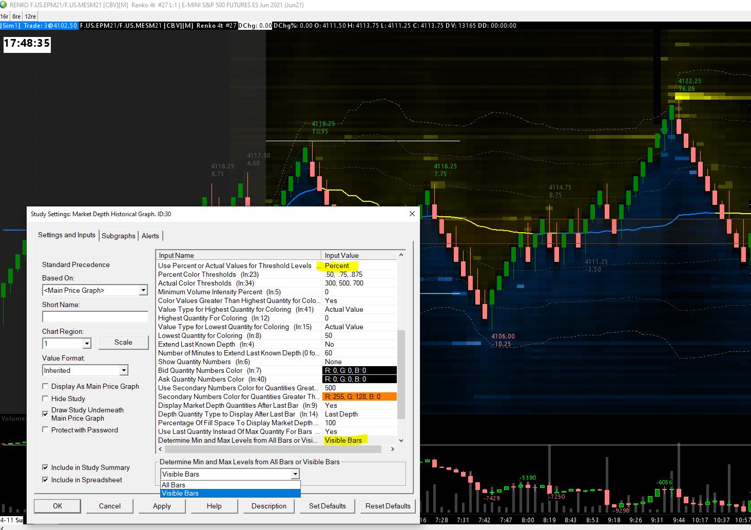 Hello SC, I'd like to suggest an enhancement to the Market Depth Historical Graph study - in the "Determine min and max levels from..." setting, (possibly) add an option to reset min/max at the start of each session. This way we could simply set the Percentage thresholds and it would work constantly when going from regular trading session (RTH; where the order book is "thicker"), to the extended trading hours where the order book is much thinner. See the screenshots attached for the same chart, when scrolling from RTH to ETH, the Market Depth Historical Graph background bars pretty much disappear because of the thinner book in ETH. Just a nice-to-have idea to add to the wish list :) Thanks, SC! You guys rock! |