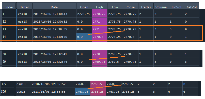 thanks. it makes sense. but is the Open = 'last trade price' always the previous close? i am including a screenshot of some examples of when the Open (as previous close) is higher then the current High and another for a 3-Trade that the previous close doesn't match the next Open. just want to make sure i am using the right value when substituting the 0.0 on Open price. please provide more clarity. thanks |