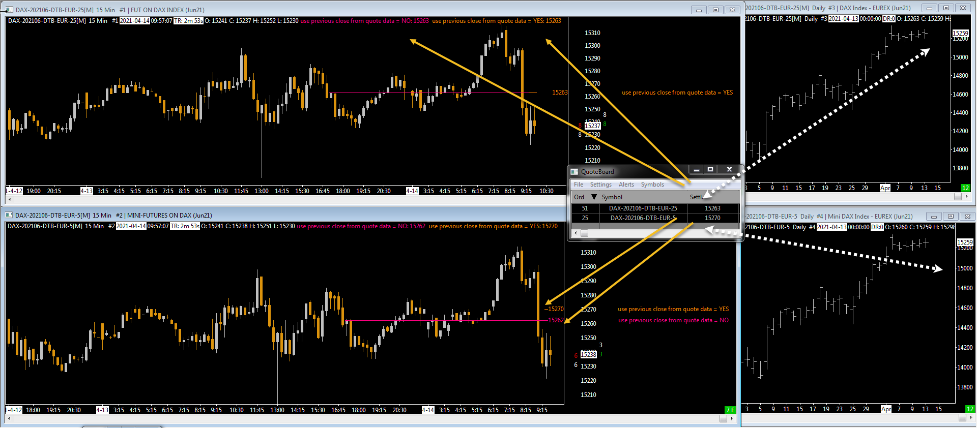 Hello, Today I have these settlements prices for DAX contracts (see screenshot attached): a/ from quote board : DAX-25 : 15263 DAX-5 : 12570 b/from the Previous close study DAX-25 : 12563 \ "Use Previous Close from Quote Data = NO" DAX-25 : 12563 \ "Use Previous Close from Quote Data = YES" DAX-5 : 12562 \ "Use Previous Close from Quote Data = NO" DAX-5 : 12570 \ "Use Previous Close from Quote Data = YES" c/ from Daily historical chart \ "Allowing real time updating of historical chart" unchecked DAX-25 : 15259 DAX-5 : 15259 Only the last values from c/ are correct : 15259 is the actual settlement price for the 2 contracts : see https://www.eurex.com/ex-en/markets/idx/dax/DAX-Futures-139902 https://www.eurex.com/ex-en/markets/idx/dax/Mini-DAX-Futures-139894 How can the quote field "Settlement" and the "Previous Close Line" study be so wrong ? There no issues with CME feed : the Quote Field for settlement is correct (same settlement price as exchange site) and the Previous Close Lines works fine. Obviously we get settlement price from Eurex as the close from historical daily chart. Can you fix that for Eurex ? Thanks in advance JM |