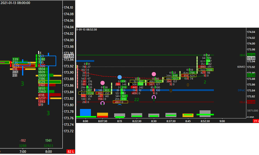 Yes, I understand that. However, the 60 minute candle is the first time the price traded at that place on the given day and the volume is huge compared to previous candles since that is the European open. To illustrate my point, I am attaching a screenshot of January 13, 2021 (same as the very first screenshot in this thread) as well as a chartbook with a 7.5 min bar chart with a custom developing VP I write about below: If you scroll to January 13, 2021 in the chart in the chartbook (which in the screenshot is the chart on the right), you see a custom (developing) volume profile for the given day from its overnight open (i.e. from 1:15 CET) to the end of the 60 min candle that starts at the European open (8:00). As you can see, the developing volume profile on the candle chart from the very open on that day shows POC at 173,87 (crosshair white line, pink line in the developing volume profile). On the contrary, the developing POC on the numbers bar chart shows developing POC at 17384. Those two POCs are inconsistent even though they are both developing from the very open at 1:15. Why is that so? Thank you. |