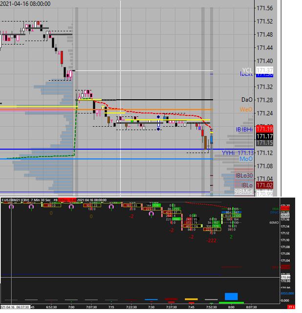I am also attaching the most actual screenshot from todays European morning. Simple counting is sufficient here: The top chart is the 7.5M bar chart so that you can see how the chart developed from the start at 1:15 AM CET and that before I started to count, nothing traded at the mentioned prices. The bottom chart is 7.5 numbers bars that include unfiltered volume numbers. The blue DPoC (developing POC from the VbP study) is marked at 171.18 that consists of volume from 7:37:30 and 8:00 as this price level traded only during those two bars. The total number traded is 437+37+604+847=1961. However if you just look at one price below, i.e. at 171.17, the total volume is 264+4+41+1838+2100=3792 which is more than twice the volume traded just one price level above. Despite that, 171.18 is marked as DPoC. Thank you. REgards, Hana |