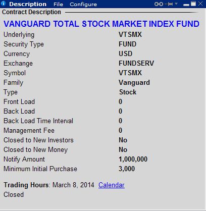 This is exactly what we need. This is the symbol to use: VTSMX-FUND-FUNDSERV-USD General Format: [mutual fund symbol]-FUND-FUNDSERV-[currency] Sierra Chart Support - Engineering Level Your definitive source for support. Other responses are from users. Try to keep your questions brief and to the point. Be aware of support policy: https://www.sierrachart.com/index.php?l=PostingInformation.php#GeneralInformation For the most reliable, advanced, and zero cost futures order routing, *change* to the Teton service: Sierra Chart Teton Futures Order Routing |