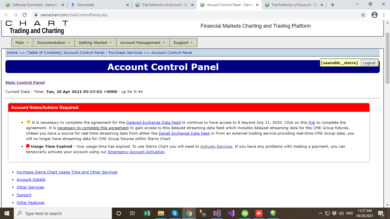 This must be an old screenshot. Your Sierra Chart account has usage time until Ending Date: 2021-05-21