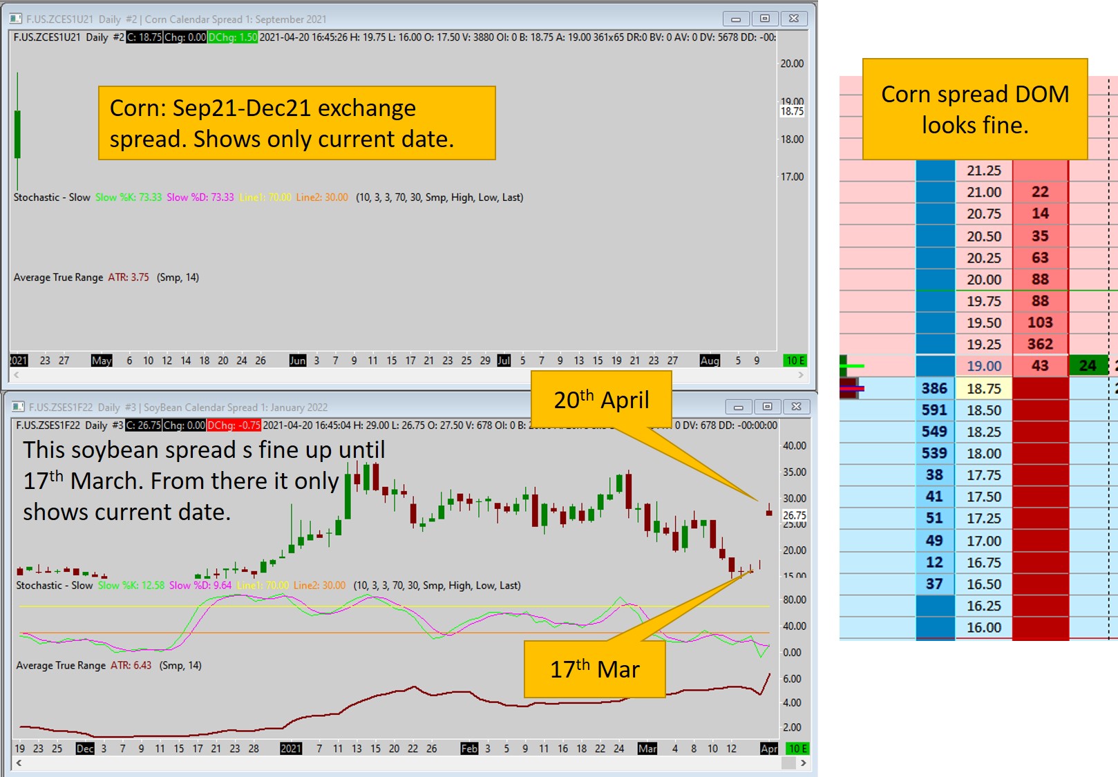 Thanks for the response. I have sent the log via the send for analysis link and referenced this post. I'm guessing you are looking for this" "No historical data client is currently set to download historical Daily data for F.US.ZCES1U21. | 2021-04-24 01:50:01.678" Note, the issue seems to be for all spreads - that is, DOM feed seems OK, but no charts. It happened around the time of your exit from AMP futures. Regards, |