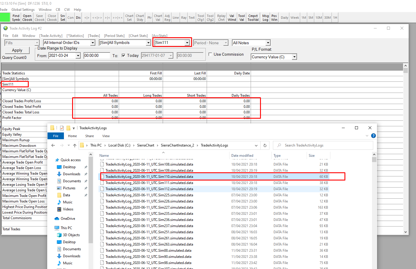 1. You need to change the From date on the Trade Activity Log, back to 2020. The trade activity is dated in the year 2020. 2. What exactly are you doing within Sierra Chart which is causing the errors above? Do those files actually exist? Sierra Chart Support - Engineering Level Your definitive source for support. Other responses are from users. Try to keep your questions brief and to the point. Be aware of support policy: https://www.sierrachart.com/index.php?l=PostingInformation.php#GeneralInformation For the most reliable, advanced, and zero cost futures order routing, *change* to the Teton service: Sierra Chart Teton Futures Order Routing Date Time Of Last Edit: 2021-04-24 23:55:08