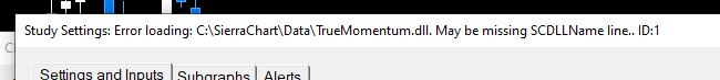 If you are trying to use the DLL you attached (TrueMomentum (3).dll), it will not load because there is a space in the file name. This is not allowed. Advanced Custom Study Interface and Language (ACSIL): Step-By-Step Instructions to Create an Advanced Custom Study Function |