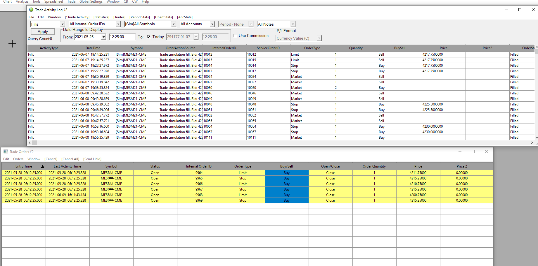In the Trade Activity Log, change your From Date back a few days and then select the "Today" button to get everything for the past few days. Then select "Fills" in the Activity filter in the upper left. Select the Apply button and then take an image of the Trade Activity Log (if there is anything showing). Then change the Symbol filter to [SIM] - All Symbols and select Apply and take another image. For the most reliable, advanced, and zero cost futures order routing, use the Teton service: Sierra Chart Teton Futures Order Routing |