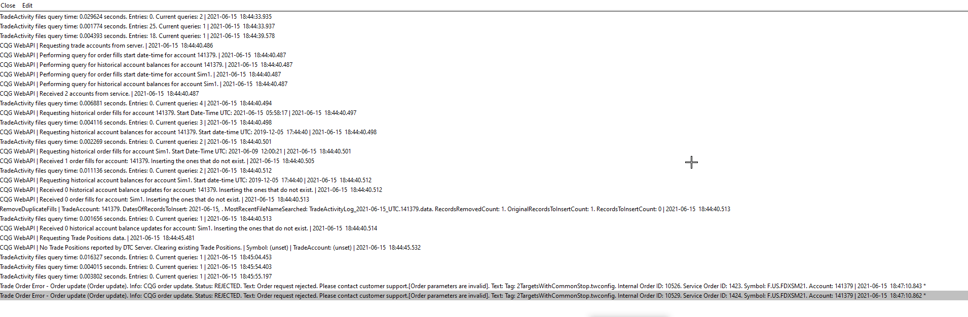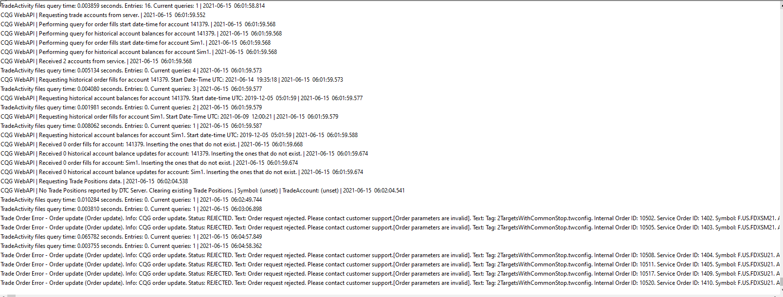 Check with your broker and see if they can tell you what "Order Parameters are invalid". That message is coming from CQG, so hopefully they can tell you. Quite often it is the Time in Force, so be sure to take a look at that in particular. Refer to the following: Basic Trading and the Trade Window: Main >> TimeInForce (Time in Force): For the most reliable, advanced, and zero cost futures order routing, use the Teton service: Sierra Chart Teton Futures Order Routing |