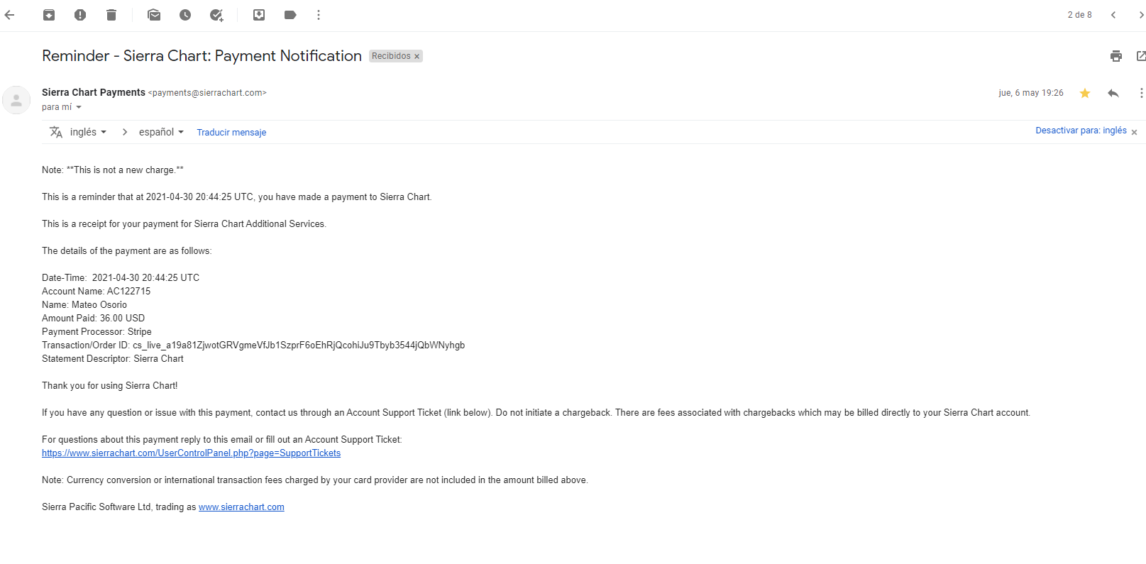 The data I need to trade is SP500 and NASDAQ futures with the level 5 package In April I made the payment to obtain the data because I understood that they would not deduct them from the account balance But despite paying 36USD for package 5 I did not receive data for the whole month Thanks for the help I attach email where the payment is evidenced Package 5 only includes the Real-Time data as we have pointed out above, for Forex and CFDs. In order to get the Real-Time data for the S&P 500 and NASDAQ Futures, you would have to use the Denali Exchange Data Feed and pay for the Real-Time data. The $36.00 you paid was for the Sierra Chart Package 5 for one month. That is just to be able to use the software. Again, the real-time data for the CME Group (which is where the futures data you are wanting is from) costs extra. In order to get the Real-Time data for the CME Group, follow these instructions: Denali Exchange Data Feed: *Setup Instructions: CME/CBOT/NYMEX/COMEX Exchanges* Note that you will get the remainder of the month in which you first activate an exchange for free, which means that if you activate it today, you would get the remainder of May for free and then pay the full exchange fee on June 1. So you may want to wait until June 1 to activate the exchange in order to save some money. For the most reliable, advanced, and zero cost futures order routing, use the Teton service: Sierra Chart Teton Futures Order Routing |