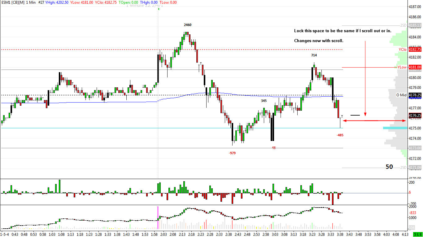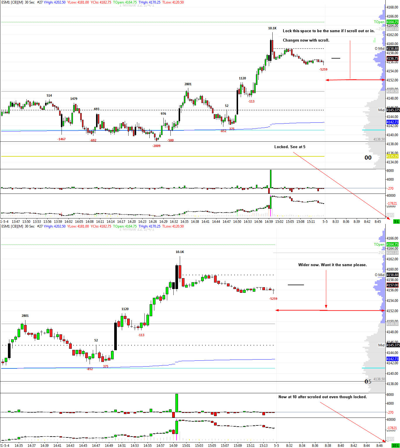 Hi, my lock space is not checked, but it's still locked. My chart looks like the poster's above. There is a lock space. I don't want it. I want my candle bars to scroll through it so that my chart is full screen. I do have a All bars Volume Profile (outline) on the right side. Not sure if that has anything to do with it, but I would like the candles to scroll right through it to the end of the screen window. Is there way to do that? |