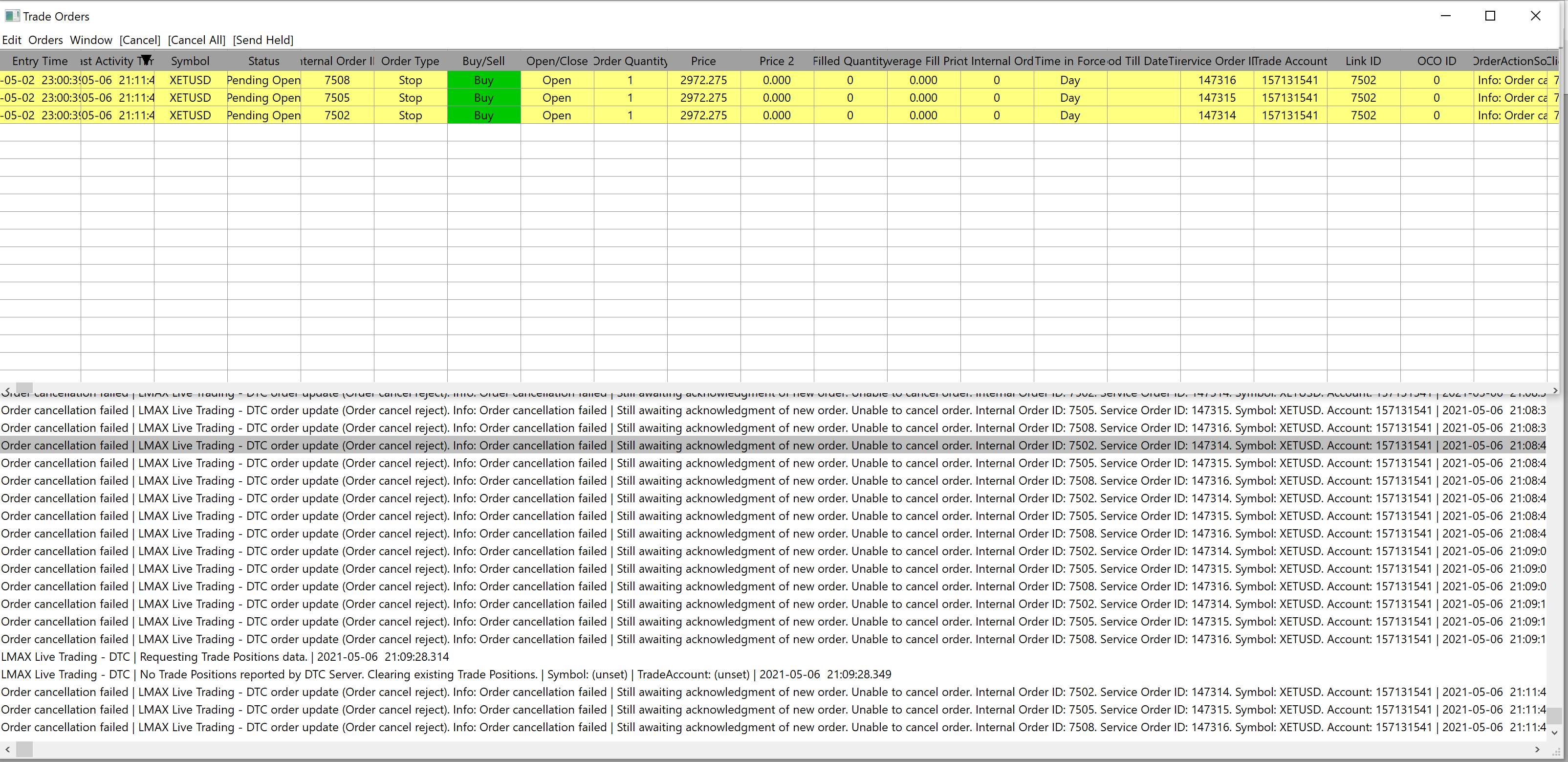 Hi, I have open orders (not positions, but orders) that I cannot delete. See screenshot attached. These open orders are not open on LMAX, I have checked and there are no open orders there. How can these open orders be deleted from Sierra? KR Thomas |