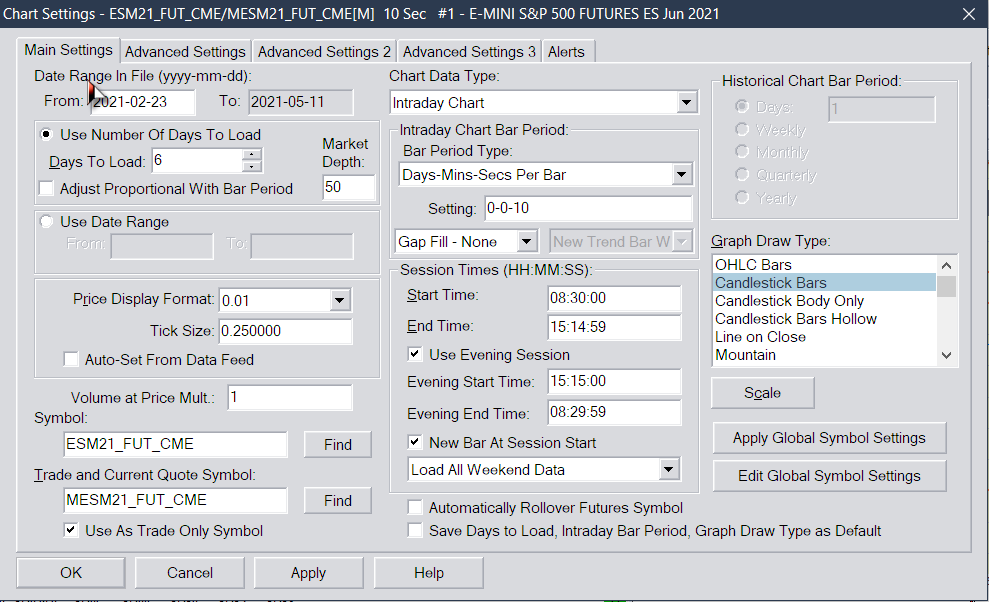 First, the images you are showing are inconsistent. You show Depth Data on 5/6 around 08:50, but then when you show the replay you are showing 5/9 around 17:00. Additionally, you are only showing a few bars in the chart on 5/9. So, if you have the Market Depth data on 5/6, then when you run the replay do you have the Market Depth data on 5/6? Additionally, you do not need to load the 61 days of Market Depth. This is what we are trying to tell you. Just leave that setting at 10. And as long as you have Market Depth for the day in question (5/6) then, when you run the Replay, it will display the Market Depth for that day, as at that point, it is the current day and will be included in the 10 days of Market Depth to load. One final pointer, when wanting to look back at a specific day, use the Use Date Range option and set it to the day you want. So when you want to see if there is depth data on 5/6, just enter 2021-05-06 for both the From and To date range. You will then get just that day displayed in the chart. For the most reliable, advanced, and zero cost futures order routing, use the Teton service: Sierra Chart Teton Futures Order Routing |