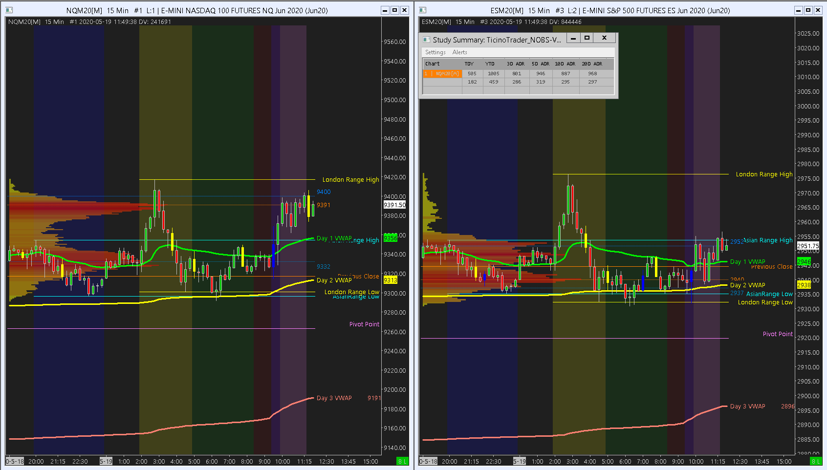 The easiest way is to signup on my site, so you do not need to waste time with reverse engineering the chartbook, but you can simply get the full description of the used studies and the exact settings of the layout + download the chartbook (including 200+ other chts) then adjust it for your needs: https://www.ticinotrader.ch/tag/nobs/ I used the Rolling VWAP study for the VWAP lines and the High/Low for Time period study. All values recalculate automatically. There are many other features running in this chartbook - in total 18 studies, pattern recognition, highlighting functions, Study Summary, etc. Created it based on the settings kindly provided by Matt @NOBSTrades. |