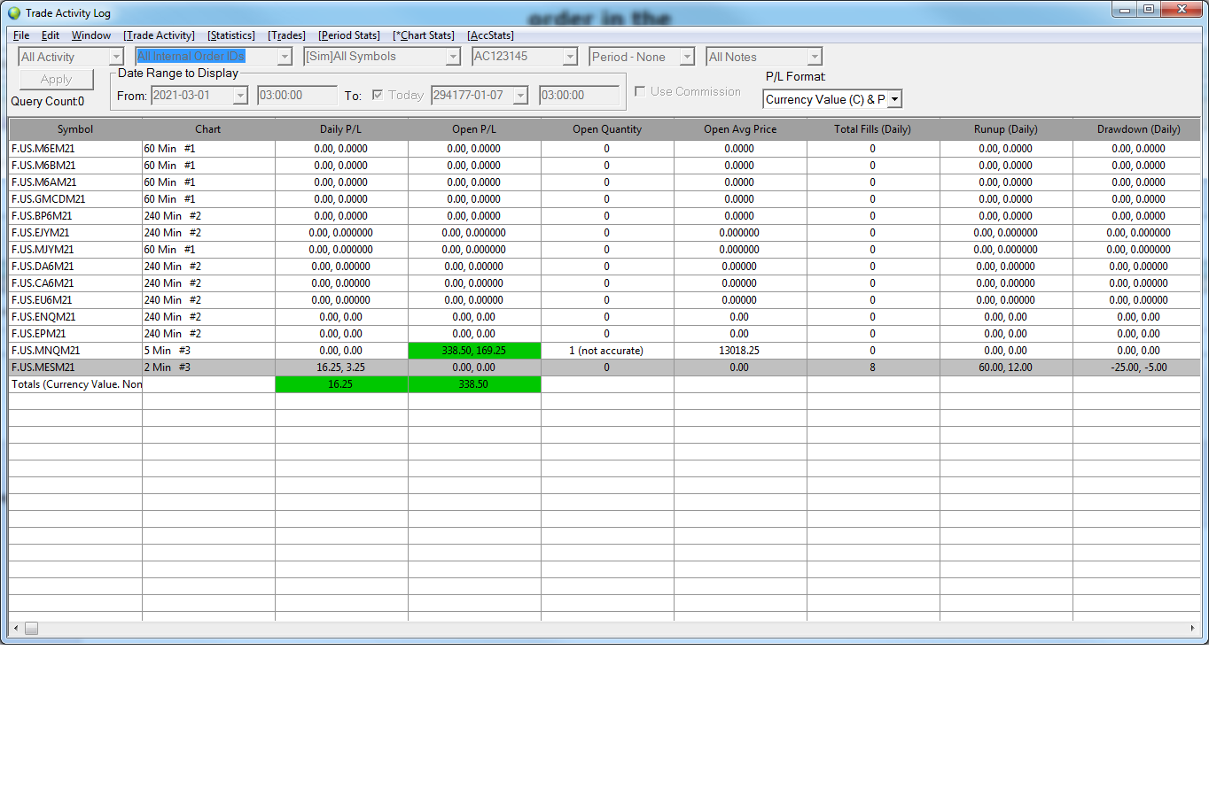 In the window Trade>Trade Activity Log> Chart Stats