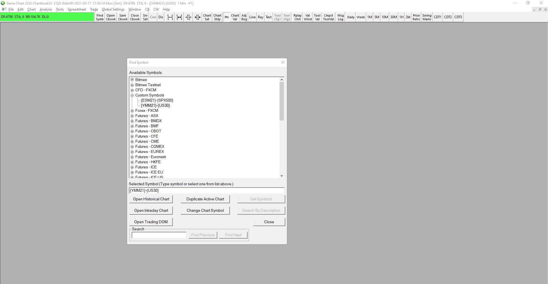 I just tried to set up the Prem for the Dow futures minus the Dow Cash Index using the CDF, US30 symbol. I followed all the directions carefully, but when I open an Intraday Chart, a chart does not appear. I also tried to get the Prem for the ES futures, and that one at least opened a chart and said it downloaded the data, but the chart was blank. |