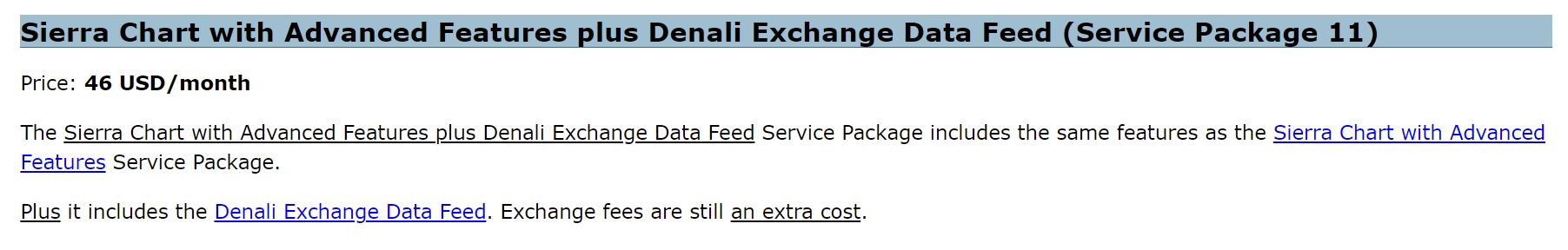 HI. I recently opened an account. I selected and was charged $46 for the Sierra Chart with Advanced Features plus Denali Exchange Data Feed (Service Package 11) (see IMG 1 of 2). I have been notified that I now need to activate a the data feed. However, It is now showing a monthly cost of $31.20 (see IMG 2 of 2). My questions are: 1) Is the $31.20 an additional monthly charge to the initial $46 (or is it a discounted price)? 2) What will be my total monthly charge from Sierra Charts (I thought is was the $46)? |