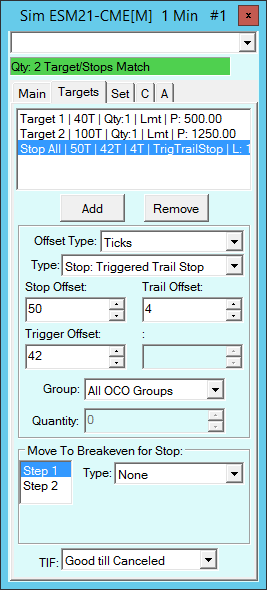 Hi, If anyone could help me with how to set up this ATM...it would be greatly appreciated. I'm trading 2 lots. There is a 50 tick initial stop on both. There is a Target of 40 ticks on 1, and a 100 tick target on the 2nd contract. However, when price goes to 20 ticks, I need to activate a 42 tick trailing stop on both, and the trailing stop adjusts or recalculates every 4 ticks. If anyone could instruct me how to do this....I'd be very grateful! Thanks, John |