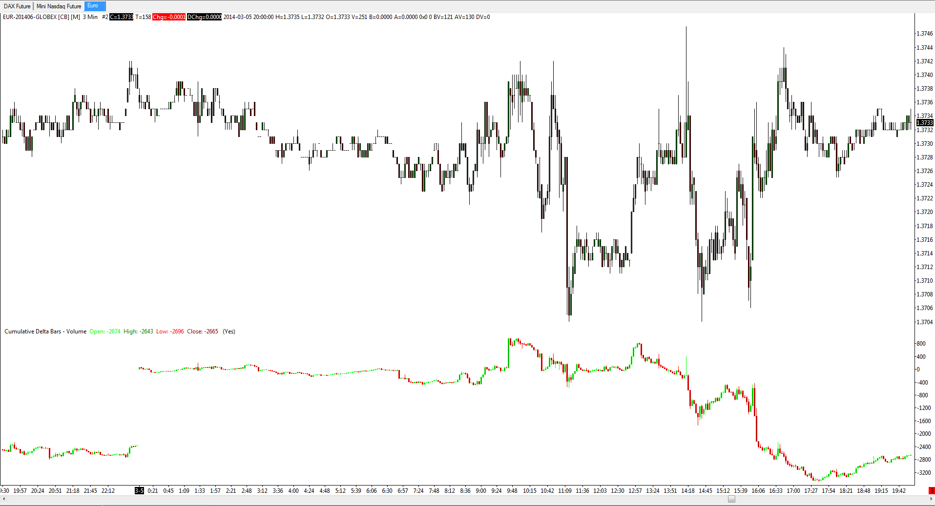 Is it my understanding that you cannot rely upon the cumulative delta on thin markets like the DAX. For example you find the same discrepancies in the Euro. I have attached two pictures, one showing the cumulative delta (not reset every day) going down while the Euro is going up and cumulative delta going sideways while the Euro is going down. In the other picture you see the cumulative delta (reset every day) going down while the Euro is going sideways. I personally do not use the cumulative delta but the DOM, therefore for me it is important that I can rely upon the information I get. What Pawel describes in his post should not happen with your data feed because he is not talking about trades occurring between, above or below the current bid and ask. What I want to say, you should not intend to get the same results with the cumulative delta like IQFeed but make sure that the problem Pawl describes will be resolved. Your data feed is really good and cheap and I personally am very satisfied. Date Time Of Last Edit: 2014-03-30 09:22:25
