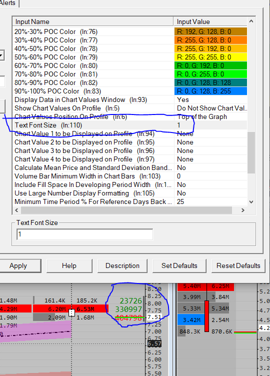 That is just the Font Size for the Show Chart Values on Profile option. To change the font size for the text displayed within the VbP bars, you need to change the Width setting for the Volume Numbers Text Color and Size (SG7) subgraph. Refer to the information here: Volume By Price Study: Volume Numbers Text Color and Size (SG7) For the most reliable, advanced, and zero cost futures order routing, use the Teton service: Sierra Chart Teton Futures Order Routing |