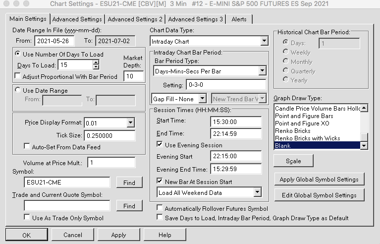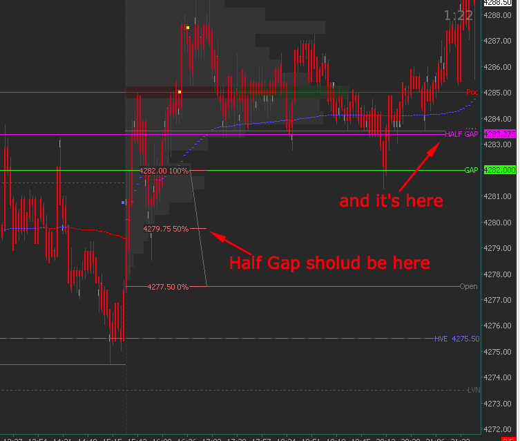 For the Gap line, do you want to plot the value of the previous RTH close? For the Half Gap line, do you want to plot the midpoint between the previous RTH Close and the current RTH Open? What is the time of the previous RTH Close you are using for the Gap? Please post a pic of your chart's Chart Settings >> Main Settings tab |