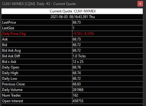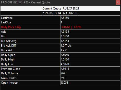 This is what we currently see for COMEX July high-grade copper: Current Quote HGN21 2021-06-03 11:40:01.270 Thu LastPrice: 4.4335 LastSize: 4 Daily Price Chg: -0.1580 | -3.44% Ask: 4.4340 Bid: 4.4330 Bid Ask Avg: 4.4335 Bid Ask Diff: 2.0 Ticks Bid x Ask: 6 x 13 Daily Open: 4.6040 Daily High: 4.6205 Daily Low: 4.4295 Previous Close: 4.5915 Daily Volume: 106568 Num Trades: 251200 Open Interest: 130429 You may have some problem with symbol mapping and be looking at data for another symbol. Follow the instructions here and do not use Custom Symbol Settings Values. You need to disable those: Follow the instructions here to update the Symbol Settings: Global Symbol Settings: Update Global Symbol Settings Sierra Chart Support - Engineering Level Your definitive source for support. Other responses are from users. Try to keep your questions brief and to the point. Be aware of support policy: https://www.sierrachart.com/index.php?l=PostingInformation.php#GeneralInformation For the most reliable, advanced, and zero cost futures order routing, *change* to the Teton service: Sierra Chart Teton Futures Order Routing Date Time Of Last Edit: 2021-06-03 15:48:33