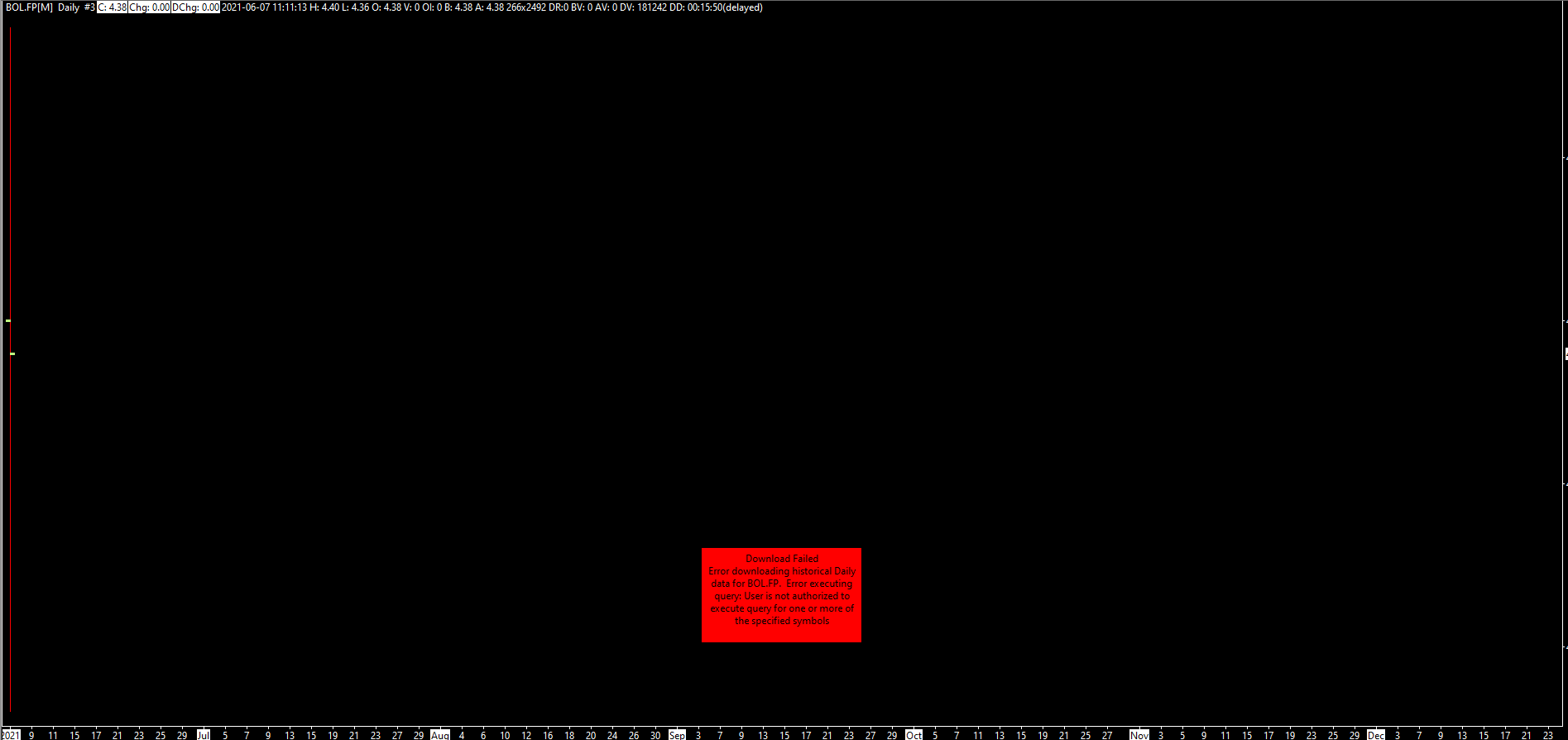 Software version: 2270 64-bit | 2021-06-07 19:48:00.601 Primary Thread ID: 12652 | 2021-06-07 19:48:00.601 Usage end date: 2021-09-13 | 2021-06-07 19:48:00.601 Enabled for: Advanced Features 2. | 2021-06-07 19:48:00.601 Enabled for: Sierra Chart Historical Data Service. | 2021-06-07 19:48:00.601 Enabled for: Sierra Chart Real-Time Exchange Data Feed. | 2021-06-07 19:48:00.601 Enabled for: Delayed Denali Exchange Data Feed. | 2021-06-07 19:48:00.601 Enabled for exchange: U.S. Equities (NYSE, NASDAQ, AMEX) | 2021-06-07 19:48:00.601 Enabled for exchange: Euronext Equities Delayed | 2021-06-07 19:48:00.601 Allow Support for Sierra Chart Data Feeds is enabled. | 2021-06-07 19:48:00.601 Current selected Data/Trading service: SC Data - All Services | 2021-06-07 19:48:00.601 Custom symbol settings values: enabled | 2021-06-07 19:48:00.601 Chart Update Interval: 500 | 2021-06-07 19:48:00.601 Intraday Data Storage Time Unit: 1 | 2021-06-07 19:48:00.601 Time Zone: +00:00:00 (UTC+00) | 2021-06-07 19:48:00.601 2021-06-07 19:48:00 Local computer time in UTC | 2021-06-07 19:48:00.601 2021-06-07 19:48:00 Local computer time in SC Time Zone | 2021-06-07 19:48:00.601 2021-06-07 19:41:20 Server time in UTC | 2021-06-07 19:48:00.601 Local computer UTC time and Server UTC time difference: 1 seconds. | 2021-06-07 19:48:00.601 Program path: C:\Trader\Soft\SC\SierraChart\ | 2021-06-07 19:48:00.601 Data Files path: C:\Trader\Soft\SC\SierraChart\Data\ | 2021-06-07 19:48:00.601 OS Version Number: 10.0 | 2021-06-07 19:48:00.601 Locale Setting: C | 2021-06-07 19:48:00.601 DLLs: UserContributedStudies_64.dll | 2021-06-07 19:48:00.602 Allowed protected custom studies: | 2021-06-07 19:48:00.602 File >> Disconnect selected. | 2021-06-07 19:48:04.473 SC Data - All Services | Waiting for socket receive thread to end | 2021-06-07 19:48:04.473 DTC Client socket (1) | CloseSocket call. | 2021-06-07 19:48:04.474 SC Data - All Services | Disconnected from the server. | 2021-06-07 19:48:04.474 SC Data - All Services | Disconnected. | 2021-06-07 19:48:04.474 DTC Client socket (1) | Shutdown started. Waiting for graceful close. | 2021-06-07 19:48:04.474 DTC Client socket (1) | Socket gracefully closed by remote side. | 2021-06-07 19:48:04.578 DTC Client socket (1) | Closed. | 2021-06-07 19:48:04.578 SC Data - All Services | Connected to server complete. | 2021-06-07 19:48:06.300 Triggering next historical data download in queue. | 2021-06-07 19:48:06.300 Triggering next historical data download in queue. | 2021-06-07 19:48:06.300 Triggering next historical data download in queue. | 2021-06-07 19:48:06.300 Triggering next historical data download in queue. | 2021-06-07 19:48:06.300 Notice: Not connected to Live trading account to receive CME realtime futures data at non-professional fees. | 2021-06-07 19:48:06.300 No download requests in the queue to start downloads for. | 2021-06-07 19:48:06.300 No download requests in the queue to start downloads for. | 2021-06-07 19:48:06.300 No download requests in the queue to start downloads for. | 2021-06-07 19:48:06.301 No download requests in the queue to start downloads for. | 2021-06-07 19:48:06.301 Mapping BN.FP to BN.FP. Service code: euronext_equities_openfeed.data | 2021-06-07 19:48:06.792 SC Data - All Services | Starting real-time market data updates for: BN.FP (BN.FP). ID: 1 Service code: euronext_equities_openfeed.data | 2021-06-07 19:48:06.792 SC Data - All Services | Connecting to the server ds1.sierracharts.com. Port 10047 | 2021-06-07 19:48:06.792 SC Data - All Services | Requesting security definition data for: BN.FP (BN.FP). ID: 1 | 2021-06-07 19:48:06.792 DTC Client socket (1) | Creating socket. | 2021-06-07 19:48:06.793 DTC Client socket (1) | New receive buffer size: 5242880 | 2021-06-07 19:48:06.793 DTC Client socket (1) | Connecting to IP: 8.18.161.135. | 2021-06-07 19:48:06.793 SC Data - All Services | Network connection to server complete. | 2021-06-07 19:48:06.901 SC Data - All Services | Starting socket receive thread. | 2021-06-07 19:48:06.901 SC Data - All Services | Sending encoding request to server: Binary VLS. Compression: standard | 2021-06-07 19:48:06.901 SC Data - All Services | Setting DTC encoding to Binary VLS | 2021-06-07 19:48:07.011 SC Data - All Services | Sending logon request message. | 2021-06-07 19:48:07.011 SC Data - All Services | Received logon response. | 2021-06-07 19:48:07.795 SC Data - All Services | Server Name: SC Realtime Server. | 2021-06-07 19:48:07.795 SC Data - All Services | Server protocol version: 8. Client protocol version: 8 | 2021-06-07 19:48:07.795 SC Data - All Services | Successfully connected. | 2021-06-07 19:48:07.795 SC Data - All Services | Trading is not supported. | 2021-06-07 19:48:07.795 SC Data - All Services | Restarting real-time data updates for symbol: BN.FP -> BN.FP | 2021-06-07 19:48:07.795 SC Data - All Services | Received security definition for symbol BN.FP | 2021-06-07 19:48:07.981 Added historical Daily data request for BN.FP to the queue. | 2021-06-07 19:48:19.038 Triggering next historical data download in queue. | 2021-06-07 19:48:19.038 HD Request # 6 | Downloading Historical Daily chart data for BN.FP. Starting date: 2021-06-07. Service: euronext_equities_openfeed.data | 2021-06-07 19:48:19.039 HD Request # 6 | Requesting historical Daily data for BN.FP starting at 2021-06-06. SC External HD service. | 2021-06-07 19:48:19.293 HD Request # 6 | Error downloading historical Daily data for BN.FP. Error executing query: User is not authorized to execute query for one or more of the specified symbols | 2021-06-07 19:48:19.838 HD Request # 6 | Received 0 records from 00:00:00 to 00:00:00 (0.0 seconds) and wrote 0 records for BN.FP | 2021-06-07 19:48:19.838 HD Request # 6 | Completion time: 0s | 2021-06-07 19:48:19.838 HD Request # 6 | Daily data download complete for BN.FP. Unique request ID: 7 | 2021-06-07 19:48:19.838 Removing historical data download ID 7. | 2021-06-07 19:48:19.838 Triggering next his