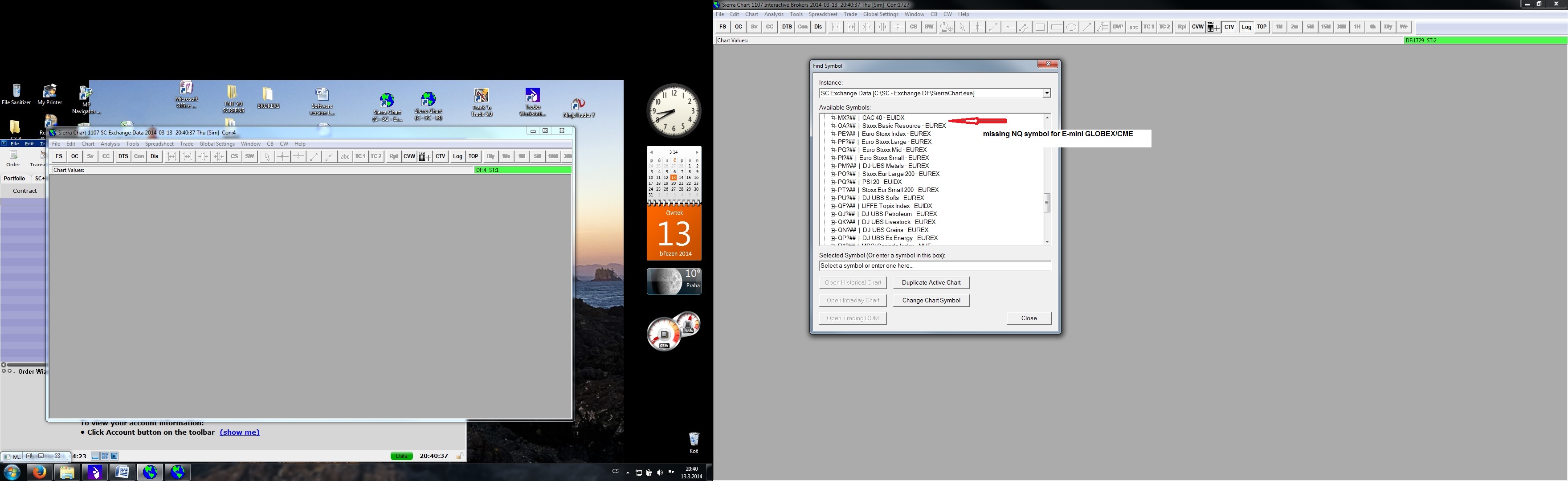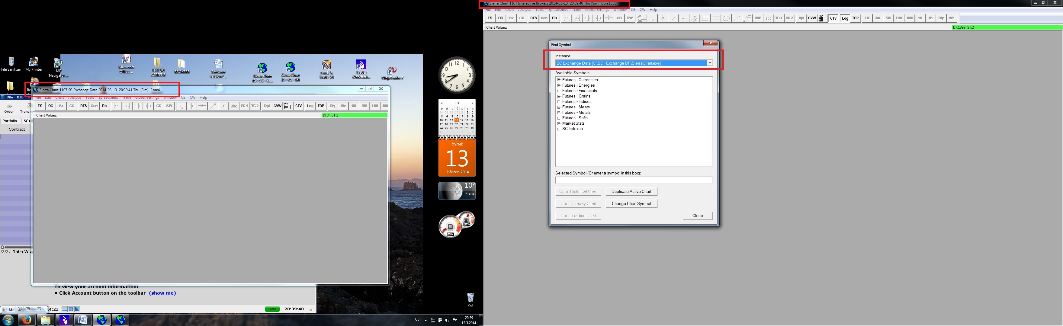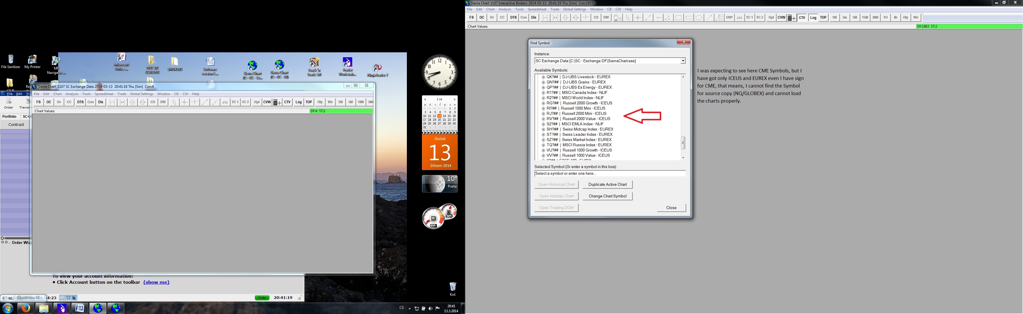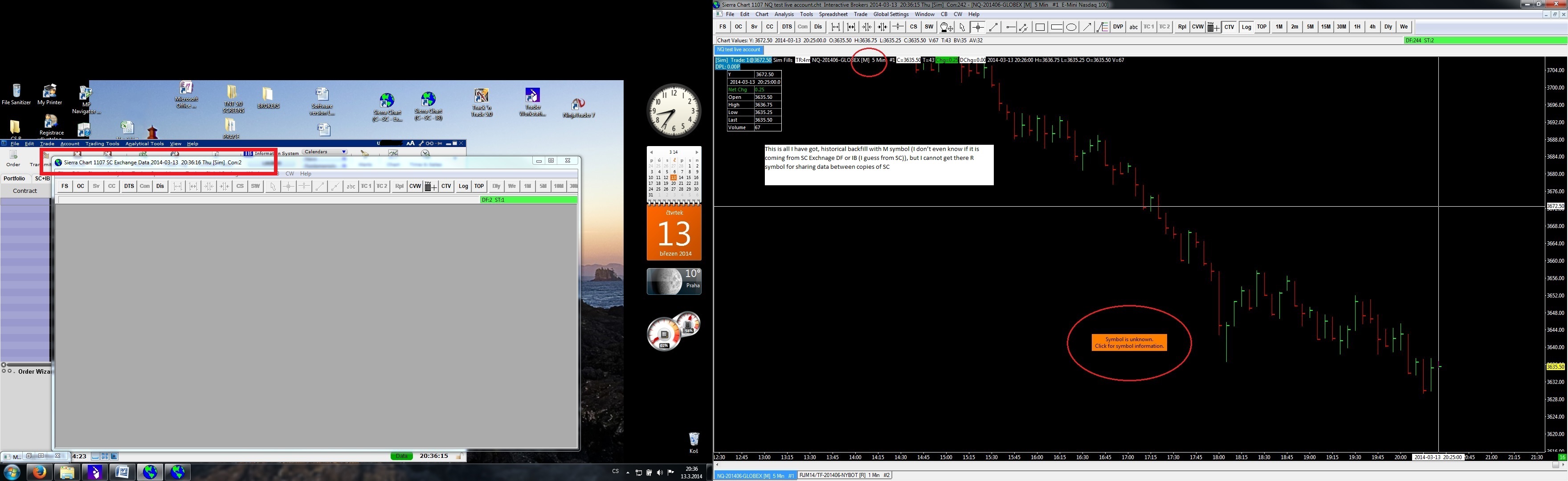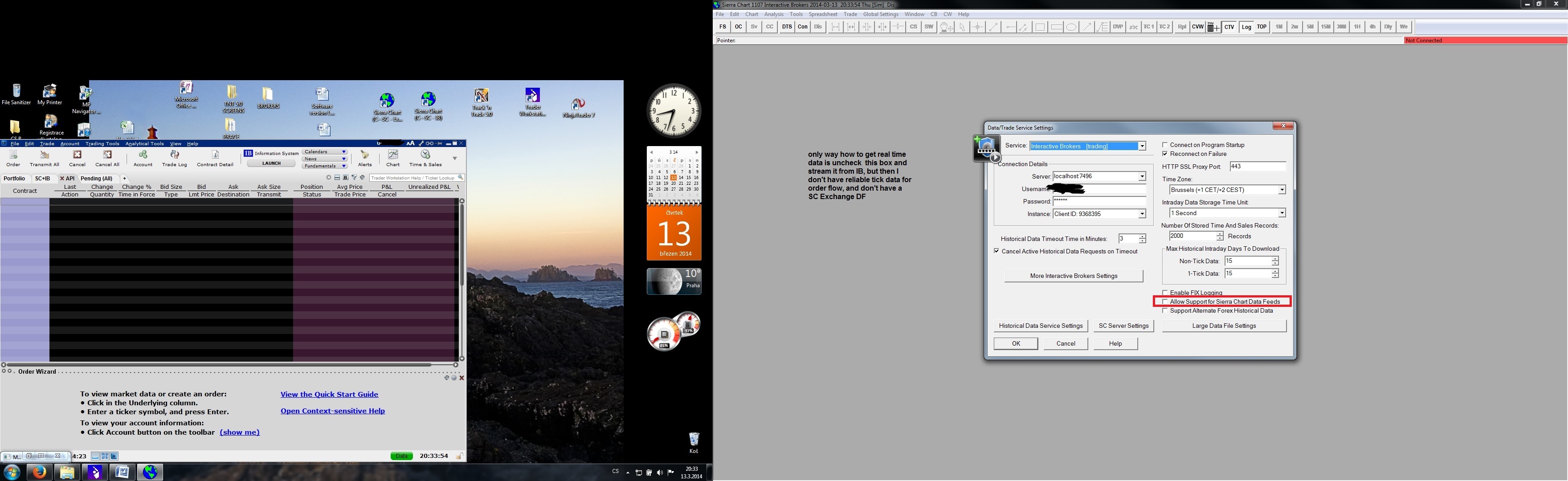 Hello, I’m having a problem with the proper data feed connection between 2 copies of SC. Even I think, that I followed all the instruction, I can't get connected. I have enclosed screen of my PC,so you can to better understand my issue, hope anybody can help Broker IB – destination copy Data feed SC Exchange DF – source copy Data service CME, CBOT… for $15.75 Perhaps I did wrongly understood the way of the connection, so if anybody can give me a hand and explain me what do I do wrong? 1. SC copy- destination copy Software version: 1107 | 2014-03-13 20:27:08 Usage end date: 2014-03-19 | 2014-03-13 20:27:08 Enabled for: Sierra Chart Historical Data Service. | 2014-03-13 20:27:08 Enabled for: Sierra Chart Real-Time Market Data Feed. | 2014-03-13 20:27:08 Enabled for: CME, CBOT, NYMEX, COMEX exchanges. | 2014-03-13 20:27:08 Received 1 data feed usernames. | 2014-03-13 20:27:08 Allow Support for Sierra Chart Data Feeds is enabled. | 2014-03-13 20:27:08 Active service: Interactive Brokers | 2014-03-13 20:27:08 Time Zone: +01:00:00 (CET+01CEST+01,M3.5.0/02:00,M10.5.0/03:00) | 2014-03-13 20:27:08 2014-03-13 20:27:08 Local computer clock time | 2014-03-13 20:27:08 2014-03-13 19:27:08 GMT time | 2014-03-13 20:27:08 2014-03-13 20:27:08 Time zone adjusted time | 2014-03-13 20:27:08 Time difference to server time: 0 seconds. | 2014-03-13 20:27:08 Program path: C:\SC - IB\ | 2014-03-13 20:27:08 Data Files path: C:\SC - IB\Data\ | 2014-03-13 20:27:08 OS Version Number: 6.1 | 2014-03-13 20:27:08 Checking for new symbol settings for ib | 2014-03-13 20:27:08 Symbol settings are up-to-date for ib | 2014-03-13 20:27:08 Current selected Data/Trading service: Interactive Brokers | 2014-03-13 20:27:14 Interactive Brokers: Connecting to 127.0.0.1:7496 | 2014-03-13 20:27:15 The network socket is connected. | 2014-03-13 20:27:15 Socket connected to TWS. Sending client version: 62. Waiting for acceptance. | 2014-03-13 20:27:15 TWS server version: 70 | 2014-03-13 20:27:15 IB: Connected. Waiting for account information. | 2014-03-13 20:27:15 IB Account information received. | 2014-03-13 20:27:15 Connected to IB Live account. | 2014-03-13 20:27:15 Interactive Brokers: Requesting Trade Positions for account: U931225 | 2014-03-13 20:27:15 Next valid order ID: 3 | 2014-03-13 20:27:15 Message from IB: Market data farm connection is OK:usfuture. IB Error Code: 2104. Request ID: -1. | 2014-03-13 20:27:15 Next valid order ID: 3 | 2014-03-13 20:27:15 IB Account information received. | 2014-03-13 20:27:15 Connected to IB Live account. | 2014-03-13 20:27:15 Interactive Brokers: Received Trade Positions download end message for account U931225 | 2014-03-13 20:27:15 IB: Requesting historical order fills for account U931225 | 2014-03-13 20:27:20 Interactive Brokers: Received Open orders end message. | 2014-03-13 20:27:20 Mapping NQ-201403-GLOBEX to NQH4. Service code: cme | 2014-03-13 20:27:26 SC Exchange Data - Starting real-time market data updates for: NQH4 | 2014-03-13 20:27:26 Using username 0 | 2014-03-13 20:27:26 SC Exchange Data: Connecting to the server scdf1.sierracharts.com. Port 443 | 2014-03-13 20:27:26 HD Request # 2 - Downloading Intraday chart data for NQ-201403-GLOBEX to the file NQ-201403-GLOBEX.scid. Service: cme | 2014-03-13 20:27:26 HD Request # 2 - Download start Date-Time: 2014-03-13 17:19:08.0 | 2014-03-13 20:27:26 HD Request # 2 - Using server: scdf1.sierracharts.com port 10149 | 2014-03-13 20:27:26 Resolved address ds6.sierracharts.com to IP 8.18.161.131 | 2014-03-13 20:27:26 Resolved address ds6.sierracharts.com to IP 8.18.161.131 | 2014-03-13 20:27:26 SC Market Stats - Starting real-time market data updates for: TICK-NASDAQ | 2014-03-13 20:27:26 SC Market Stats: Connecting to the server ds4.sierracharts.com. Port 443 | 2014-03-13 20:27:26 Resolved address ds4.sierracharts.com to IP 204.11.49.26 | 2014-03-13 20:27:26 The network socket is connected. | 2014-03-13 20:27:26 HD Request # 2 - Sending historical data logon request message. | 2014-03-13 20:27:26 The network socket is connected. | 2014-03-13 20:27:26 SC Exchange Data: Connected to server. | 2014-03-13 20:27:26 SC Exchange Data: Sending logon request message. | 2014-03-13 20:27:26 The network socket is connected. | 2014-03-13 20:27:26 SC Market Stats: Connected to server. | 2014-03-13 20:27:26 SC Market Stats: Sending logon request message. | 2014-03-13 20:27:26 Chart #3 has tagged chart #1 for full recalculation. Chartbook: Trading Chartbook NQ.cht | 2014-03-13 20:27:26 Chart #3 has tagged chart #1 for full recalculation. Chartbook: Trading Chartbook NQ.cht | 2014-03-13 20:27:26 Chart #1 is performing a full recalculation because it has been tagged. Chartbook: Trading Chartbook NQ.cht | 2014-03-13 20:27:26 SC Market Stats Server Info - Server Name: . Server Version: . Provider Name: . | 2014-03-13 20:27:27 SC Market Stats - Server protocol version: 3. Client protocol version: 3. There is a protocol match. | 2014-03-13 20:27:27 SC Market Stats - Successfully connected. | 2014-03-13 20:27:27 SC Market Stats - Restarting real-time data updates for symbol: TICK-NASDAQ | 2014-03-13 20:27:27 HD Request # 2 - Requesting Intraday data. Max. days to return: 100. Start Date-Time: 2014-03-13 16:19:08. Record interval: 1 | 2014-03-13 20:27:27 SC Exchange Data Server Info - Server Name: . Server Version: . Provider Name: . | 2014-03-13 20:27:28 SC Exchange Data - Server protocol version: 3. Client protocol version: 3. There is a protocol match. | 2014-03-13 20:27:28 SC Exchange Data - Successfully connected. | 2014-03-13 20:27:28 SC Exchange Data - Restarting real-time data updates for symbol: NQ-201403-GLOBEX -> NQH4 | 2014-03-13 20:27:28 HD Request # 2 - Decompressing data. | 2014-03-13 20:27:28 HD Request # 2 - Receiving Intraday data for NQ-201403-GLOBEX starting at 2014-03-13 17:19:08 | 2014-03-13 20:27:28 HD Request # 2 - Timestamp of first Intraday data file record written: 2014-03-13 17:19:08 | 2014-03-13 20:27:28 Symbol Error - NQ-201403-GL