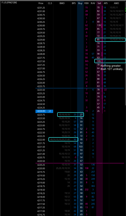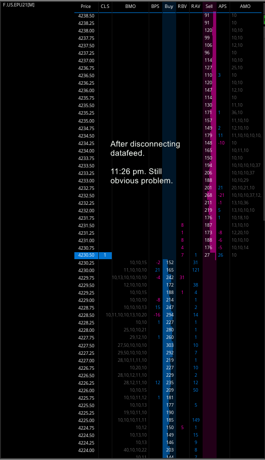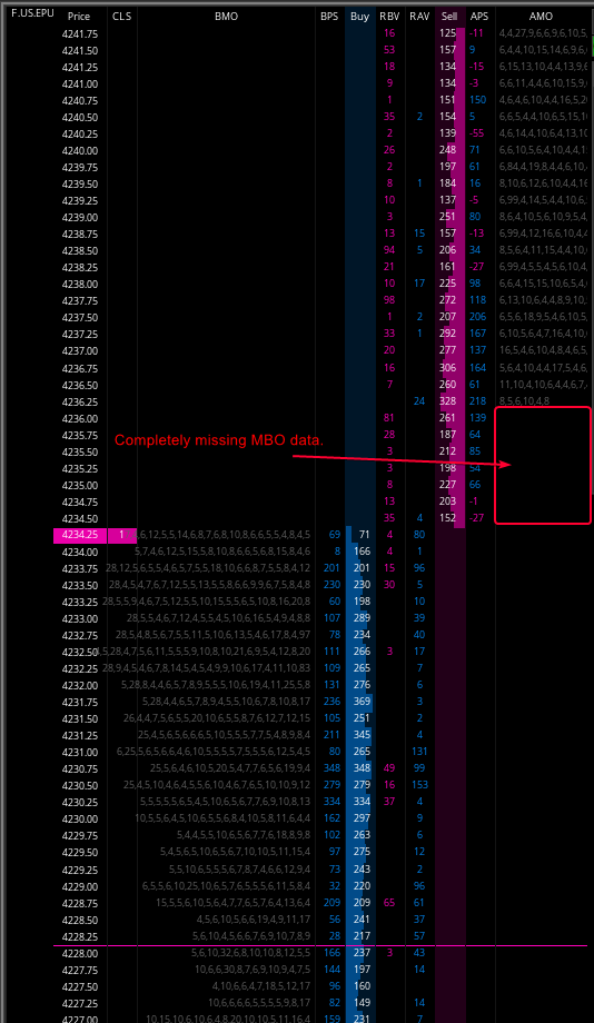 The following video shows, and columns are from left to right: Price Bid Market Order (bid MBO), bid pulling/stacking, bids, recent bid volume, recent ask volume, asks, ask pulling/stacking, Ask Market Order (ask MBO). The column I'm wanting you to look at it is the bid MBO next to price. It is shaded light gray. Notice the quantities are completely incorrect? I have to disconnect and reconnect my data multiple times per day in order for quantities to show up correctly. Why do I know that the data is not showing up correctly sometimes? Because I will see 400 or 500 lots come into the ES book on either the bid or ask side, and the MBO data does not even reflect a size greater than 10. If I then disconnect and reconnect data, the MBO refreshes and I see the limit order size. I have set the MBO minimum size to 10 on ES, but also removed that and let the default (4) run, and I get these same issues either way. Please see video link (very short < 30 seconds) and the screenshot where I've shown obvious errors (MBO limit orders are greater than actual bids for example): http://somup.com/cr16Viq4nV |