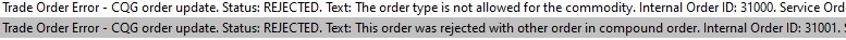 CQG gave you an error regarding the order type. What are the order types you used for the Attached Orders? For information about Attached Orders, refer to: Attached Orders Only use a Limit order or a Stop or Stop Limit order. Sierra Chart Support - Engineering Level Your definitive source for support. Other responses are from users. Try to keep your questions brief and to the point. Be aware of support policy: https://www.sierrachart.com/index.php?l=PostingInformation.php#GeneralInformation For the most reliable, advanced, and zero cost futures order routing, *change* to the Teton service: Sierra Chart Teton Futures Order Routing Date Time Of Last Edit: 2021-06-10 15:36:48