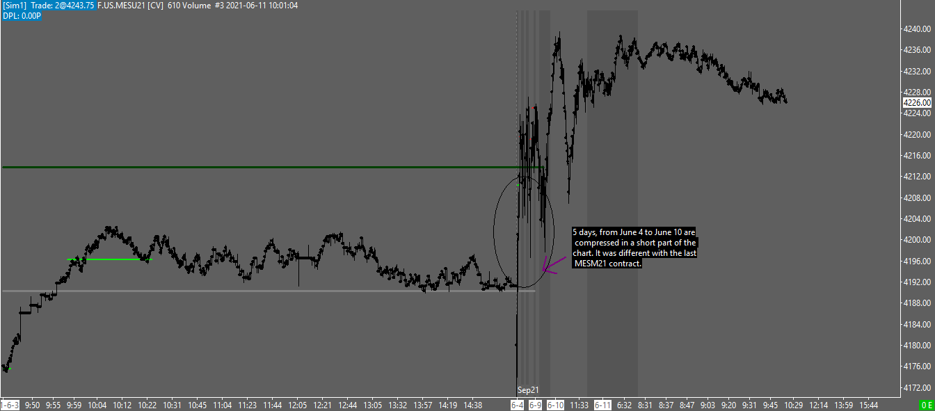 Hi. I am trying to do the rollover of the MESM21 to MESU21. When I do it, the new chart is quite extrange. It compresses from June 4 to June 10 in short part of the chart. I do not know what to do. I trade using ticks charts and They are not working properly with sierrachart. I asked to friends who use ninjatrader and they are not having those problems with ticks charts http://www.sierrachart.com/image.php?Image=1623423668237.png |