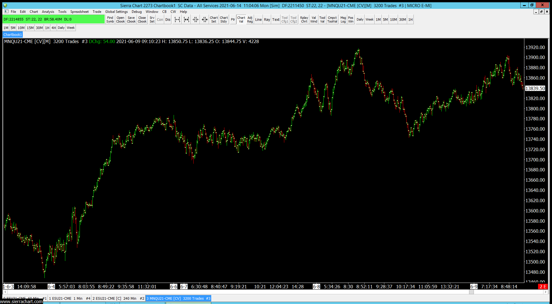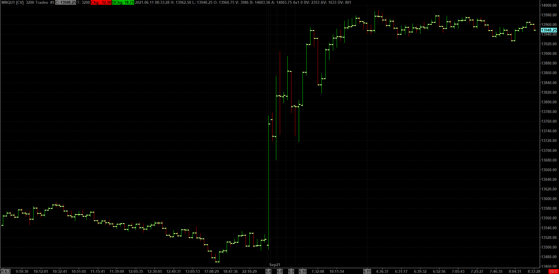 Here is what we see for that same symbol and chart type (3200 trades) when using our Denali Exchange Data Feed: http://www.sierrachart.com/image.php?Image=1623686648129.png There must be something about the volumes in the underlying data that is not correct. We really recommend changing to using the Denali Exchange Data Feed to ensure that you do not continue to have issues related to this. Refer to the information here: Denali Exchange Data Feed For the most reliable, advanced, and zero cost futures order routing, use the Teton service: Sierra Chart Teton Futures Order Routing |