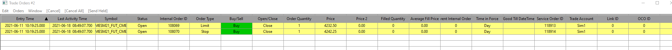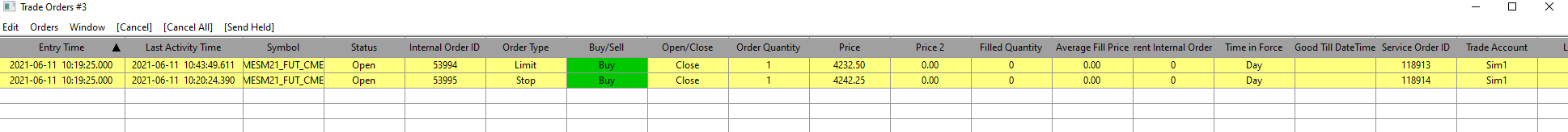Thanks you . I do see what appears to be the remaining child orders for the stop and target on 6/11 when looking at the trade orders. However, I do not see them in the trade activity log. These are left over SIM orders. I usually can delete them from the activity log but it is empty and the 2 orders are still showing on the Trade Order page. How can i delete/cancel them. the cancel etc. does not work on the trade order page. The same is true for a second instance I have. I attached pictures of the two instances below. Could you clear these for me? they are obviously not active since we have went through these prices at a later date. The exact same orders are in Instances 2 and 3 as show below |