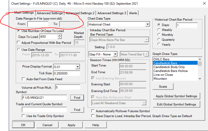 To begin with, the "To" date is not editable. It will almost always be the current day. The typical reason both the "From" and "To" fields are empty is that the system is downloading the data. If the system is not downloading data and you are still showing nothing in those fields, then the question is whether you have the bars properly displayed in the chart. Let us know what you are seeing at this time. For the most reliable, advanced, and zero cost futures order routing, use the Teton service: Sierra Chart Teton Futures Order Routing |