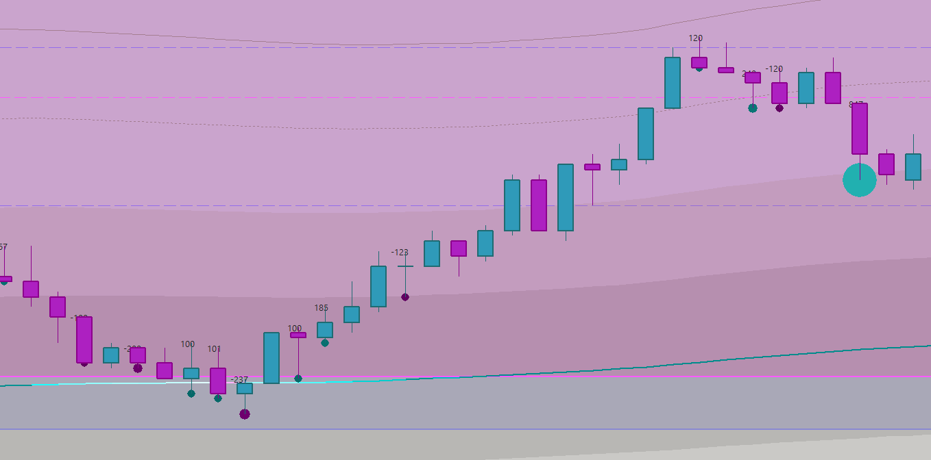 Very much appreciate that sierra added the large volume indicator. It would be a huge improvement if the text was centered on the candle and it was displayed above/ below the wick instead of obstructing the candles. This would be great as well for the circles. Thank you