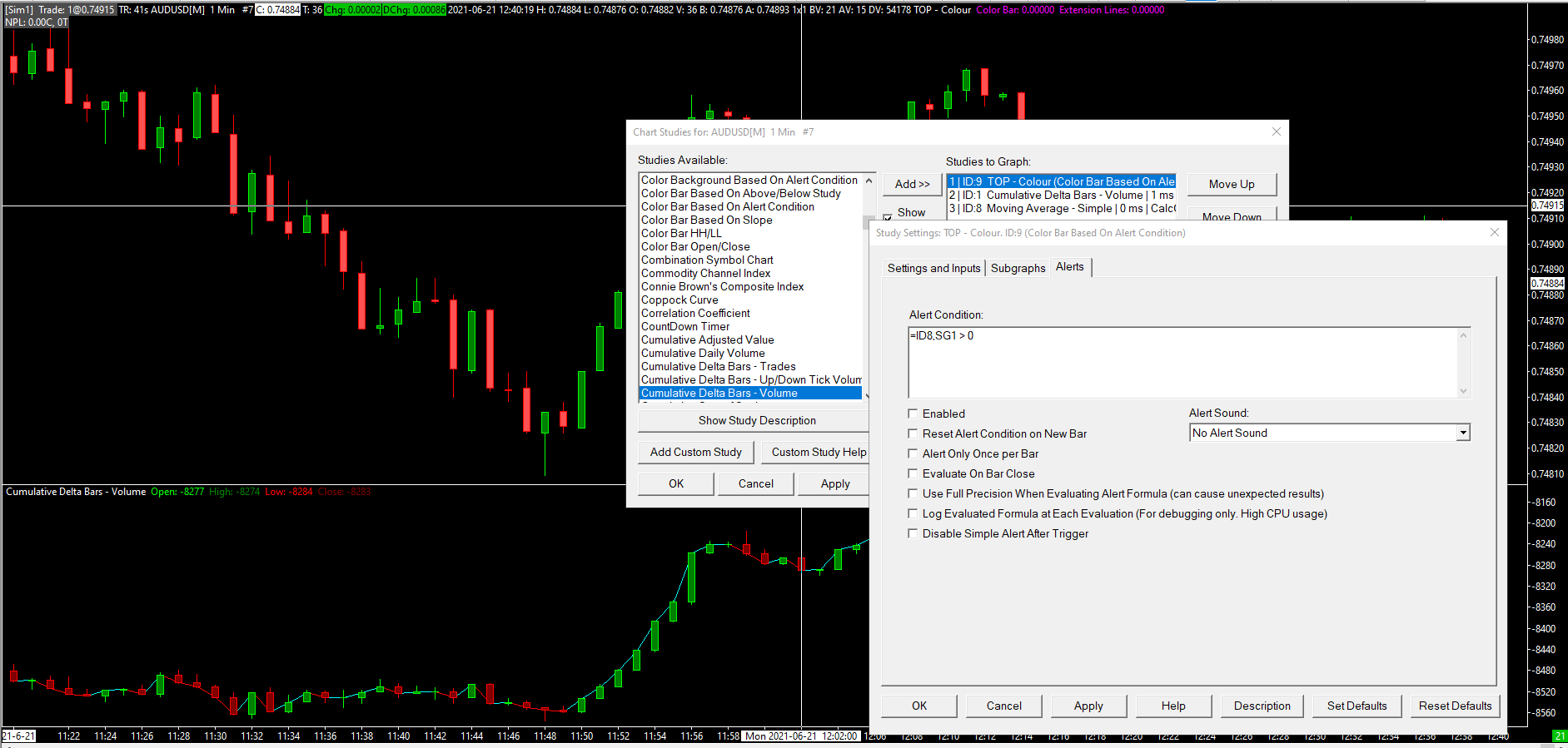 HElPPPppPPppp.................How to Colour Price Bars, base on those Green bar and Red bar for that Cumulative Delta Volume ? Try out search on how to do it, can't get it. Come to board for Help. Thank You SG and ID details on attachment PNG file Color Bar Based on Alert Condition study http://www.sierrachart.com/image.php?Image=162425045675.png Date Time Of Last Edit: 2021-06-21 04:52:54