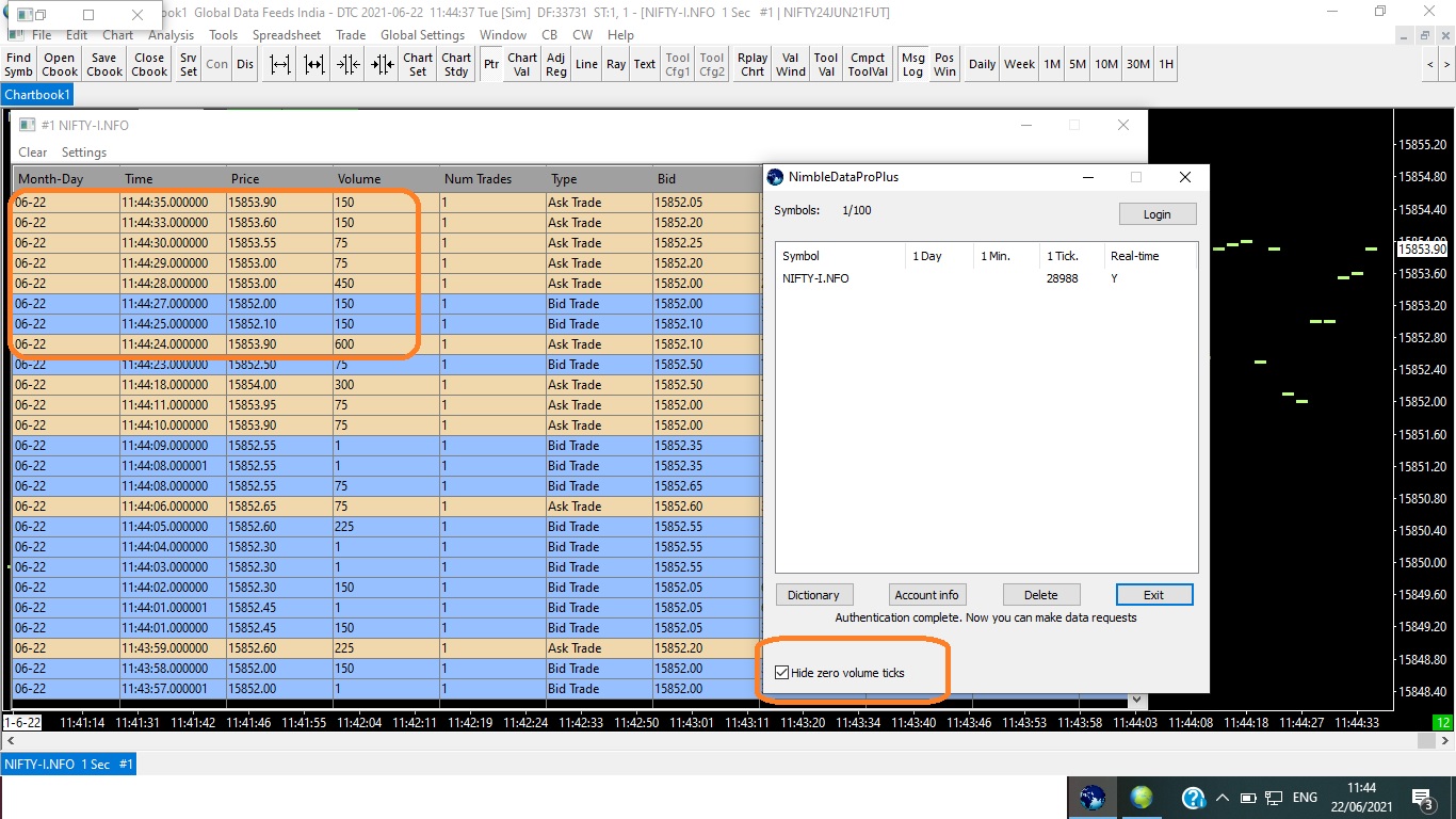 Hi Global Data Feeds updated me as "whenever there is Zero Volume in a particular tick, SierraChart shows 1 in Volume column; and if we select “ Hide Zero Volume “ from nimbledataPlusLite dashboard and it will not show 1 volume column." I did as told by Global Data Feeds, and now everything works fine. Thanks |