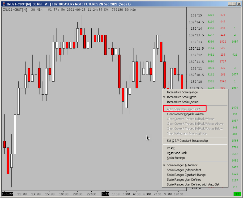 But when the Trade -> Show Market Data Columns option is selected, the 'Auto Scale the ChartDOM' feature is disabled (greyed out).