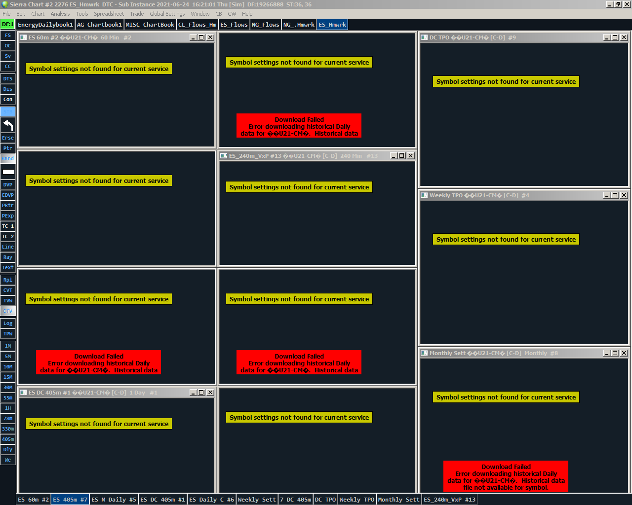 We apologize for not calling you today. We will do that tomorrow. We needed to do a software update, to disable the automatic symbol translation when a Chartbook is opened. The problem is this should not cause a problem. We do not have any other reports of an issue. Nothing. And the translation we are seeing to these unusual characters makes no sense at all. We do not even see how that could happen unless something is corrupted with a symbol when the Chartbook is opened or the translation patterns in the Symbol Settings file. Something is getting corrupted somewhere. Sierra Chart Support - Engineering Level Your definitive source for support. Other responses are from users. Try to keep your questions brief and to the point. Be aware of support policy: https://www.sierrachart.com/index.php?l=PostingInformation.php#GeneralInformation For the most reliable, advanced, and zero cost futures order routing, use the Teton service: Sierra Chart Teton Futures Order Routing Date Time Of Last Edit: 2021-06-25 07:16:34