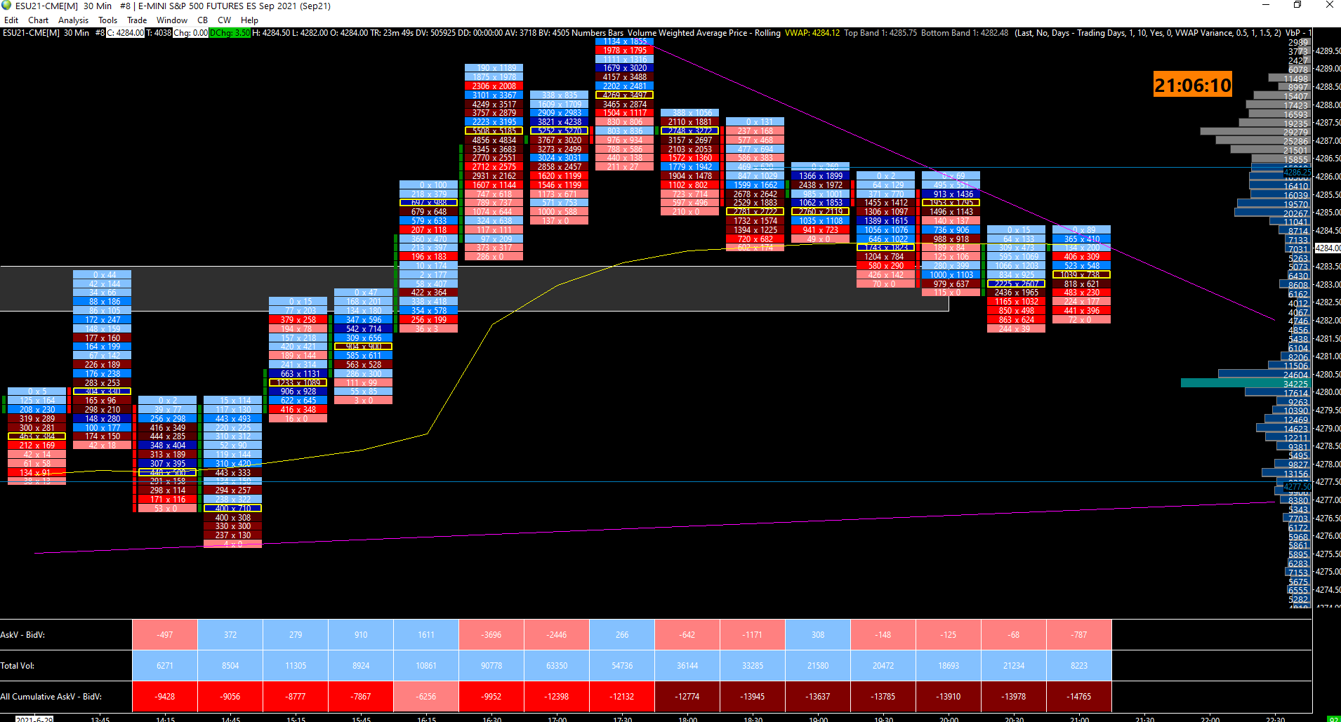 Hello, Thank you for the reply. I understand, but here's another example, at today's open (16:30) with 5 minute rotations this time. The bar prior the open has 6 times less volume (5664 vs. 31046), the 5 min bar following the open has 2x less. They are all colored the same. I specifically changed the 25-50% color to a darker blue, yet there is no difference. The open volume, thus far, has been the highest so according to my color scale, it should be darkest. http://www.sierrachart.com/image.php?Image=1624996172310.png Edit: I tried changing the data used from "All data" to "Daily Data" and it now shows colors properly. If I understand right, it was previously taking into account the data from previous days and current day altogether, while right now it only accounts for current day data (based on the session time I have input in my chart settings). Did I get it right? Date Time Of Last Edit: 2021-06-29 19:59:35