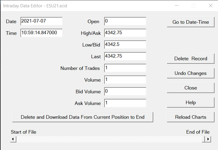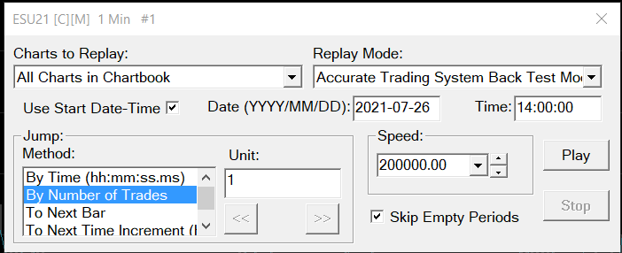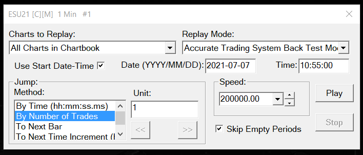 Below is a log showing all study calls during a replay from 7/7/21 10:55 The last tick of available data is at 10:59:14 The study is set for manual looping The chart is configured for 1 minute bars Sierra Chart is disconnected Attached are the replay settings and the last tick of data for the symbol As you can see: IsReplayRunning is turned off starting at 10:58. Shouldn't this be set thru the last bar at 10:59? GetReplayHasFinishedStatus is set at 10:58. Shouldn't this be set at the 10:59 bar? The last bar of the replay (10:59) is called twice but with both flags cleared. Why is the last bar not included in the replay? IsReplayRunning:0 GetReplayHasFinishedStatus:0 UpdateStartIndex:10,494 2021-07-7 10:59:00 IsReplayRunning:0 GetReplayHasFinishedStatus:0 UpdateStartIndex:0 2021-06-27 17:00:00 IsReplayRunning:0 GetReplayHasFinishedStatus:0 UpdateStartIndex:10,494 2021-07-7 10:59:00 IsReplayRunning:1 GetReplayHasFinishedStatus:0 UpdateStartIndex:0 2021-06-27 17:00:00 IsReplayRunning:1 GetReplayHasFinishedStatus:0 UpdateStartIndex:10,490 2021-07-7 10:55:00 IsReplayRunning:1 GetReplayHasFinishedStatus:0 UpdateStartIndex:10,491 2021-07-7 10:56:00 IsReplayRunning:1 GetReplayHasFinishedStatus:0 UpdateStartIndex:10,492 2021-07-7 10:57:00 IsReplayRunning:0 GetReplayHasFinishedStatus:1 UpdateStartIndex:10,493 2021-07-7 10:58:00 IsReplayRunning:0 GetReplayHasFinishedStatus:0 UpdateStartIndex:10,494 2021-07-7 10:59:00 IsReplayRunning:0 GetReplayHasFinishedStatus:0 UpdateStartIndex:10,494 2021-07-7 10:59:00 |