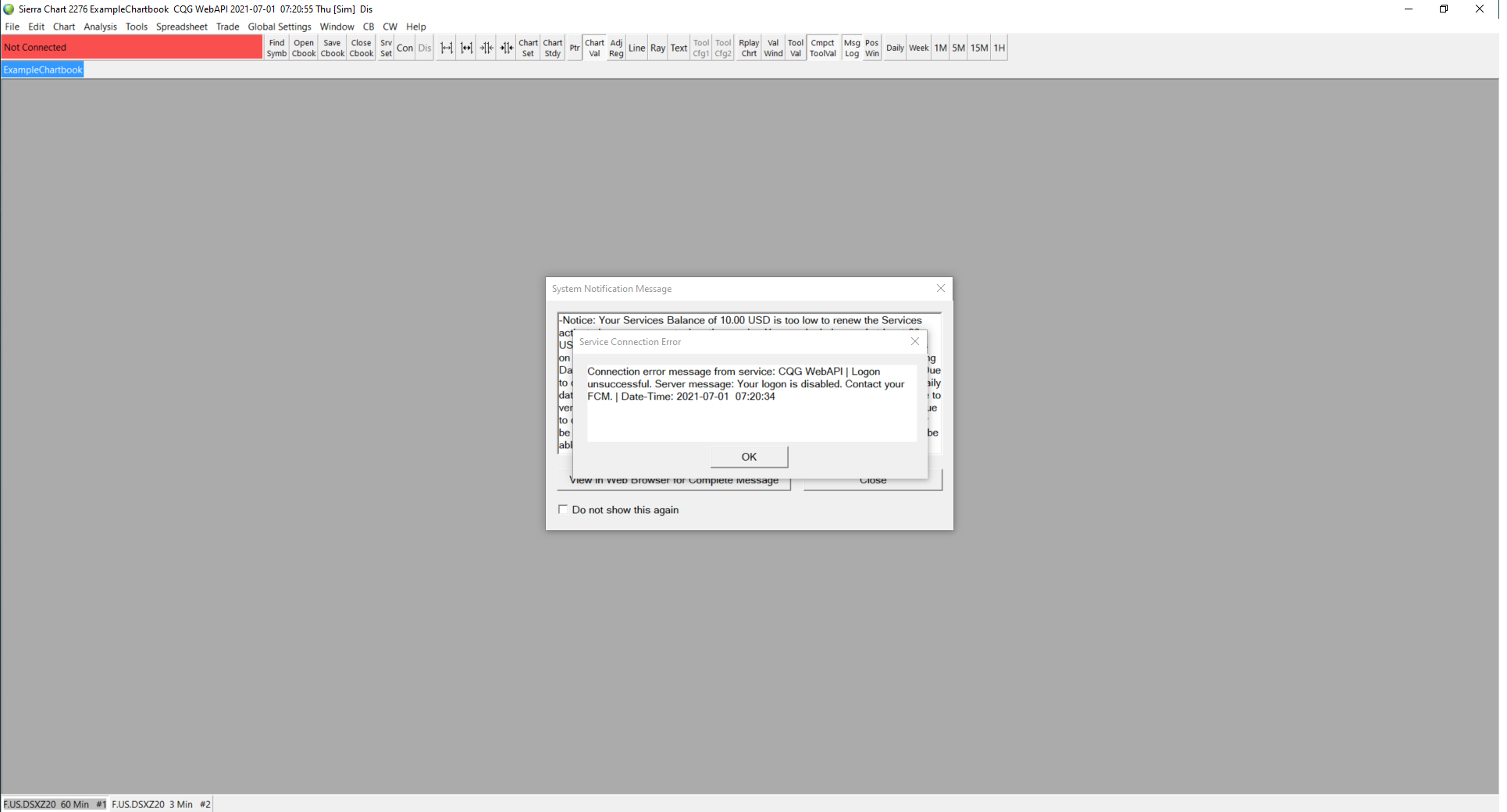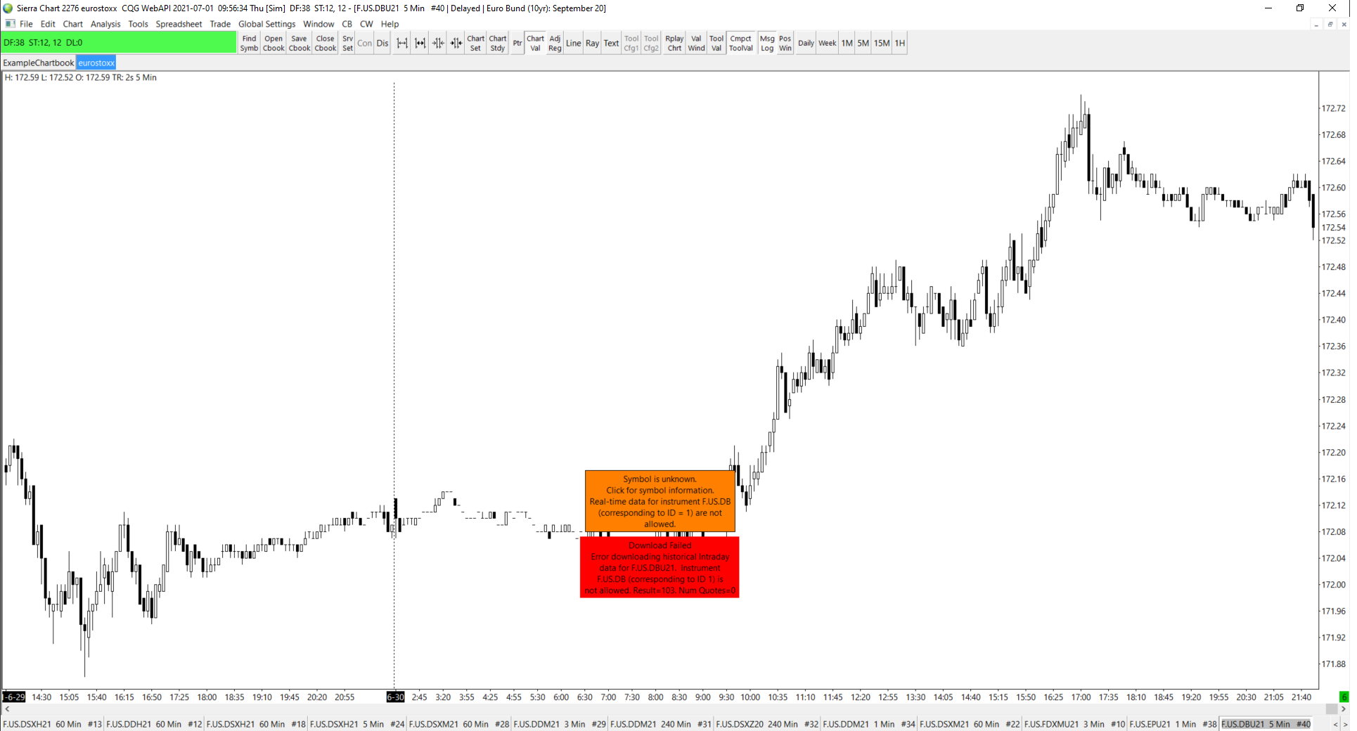 You need to contact your broker about this. For now to access delayed market data, set Global Settings >> Data/Trade Service Settings >> Current Selected Service to SC Data-All Services. And then translate the symbols in your Chartbooks with this command: Edit Menu: Edit >> Translate Symbols To Current Service ( Translate Symbols To Current Service) Sierra Chart Support - Engineering Level Your definitive source for support. Other responses are from users. Try to keep your questions brief and to the point. Be aware of support policy: https://www.sierrachart.com/index.php?l=PostingInformation.php#GeneralInformation For the most reliable, advanced, and zero cost futures order routing, *change* to the Teton service: Sierra Chart Teton Futures Order Routing |