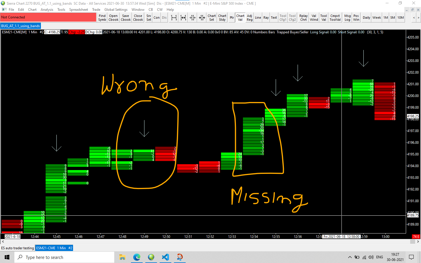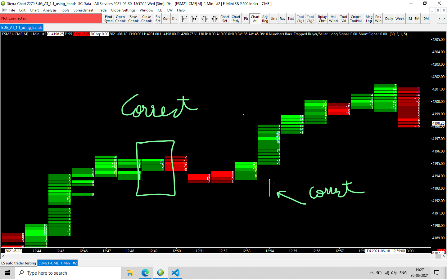 s_VolumeAtPriceV2 *p_VolumeAtPrice=NULL; for(int barIndex = sc.Index; barIndex > max(0 , sc.Index - periodLookback.GetInt()) ; barIndex--) { int VAPSizeAtBarIndex = sc.VolumeAtPriceForBars->GetSizeAtBarIndex(barIndex); for (int VAPIndex = 0; VAPIndex < VAPSizeAtBarIndex; VAPIndex++) { if (!sc.VolumeAtPriceForBars->GetVAPElementAtIndex(barIndex, VAPIndex, &p_VolumeAtPrice)) continue; //Calculate the price. This requires multiplying p_VolumeAtPrice->PriceInTicks by the tick size float Price = ((float)p_VolumeAtPrice->PriceInTicks) * sc.TickSize; //Other members available: int AskVolume = (int)p_VolumeAtPrice->AskVolume; int BidVolume = (int)p_VolumeAtPrice->BidVolume; Delta[Price]+= (AskVolume - BidVolume); } } But this is not working at all. Delta = askvol - bidvol periodLookBack() = N bars This code is similar to the code provided but doesn't work This gives different result during chart replay and normally when applied on chart as it can be shown in the picture attached |