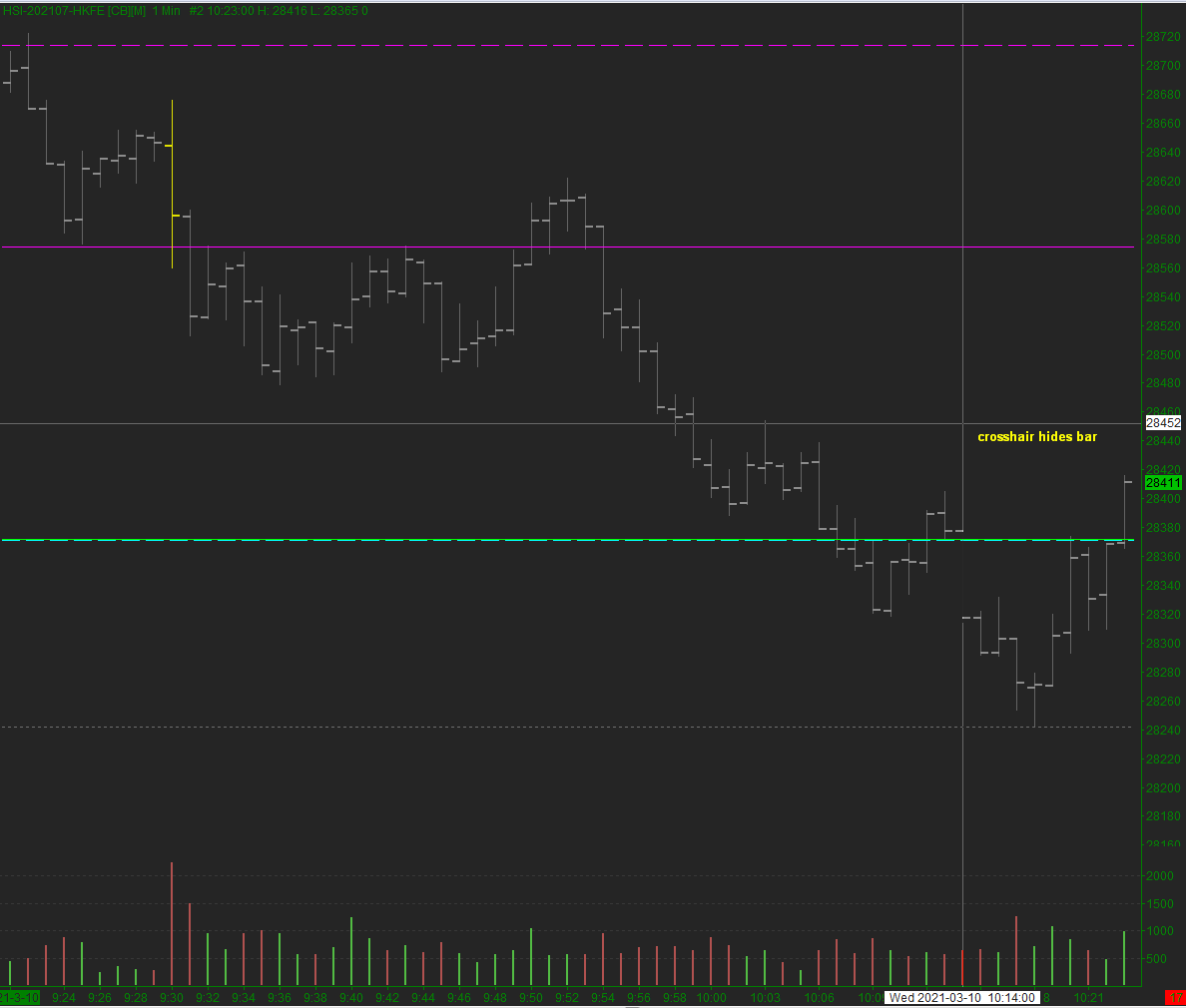 This has always been a problem since I have been using SC. The way you draw the vertical line of the crosshair interferes and hides the bar. Most other charting programs instead will highlight the entire vertical background (user customizable colour) space of the bar width. This makes study and review across multiple charts with global crosshair enabled so much easier and less of a mental juggling act. I hope you would consider making this adjustment.