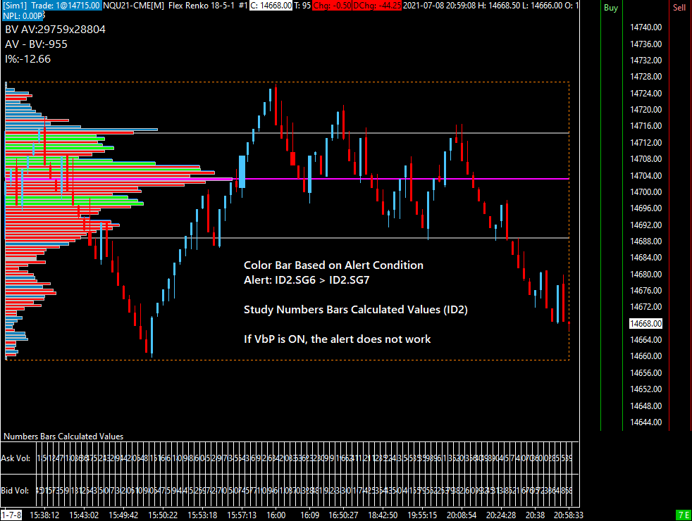 1) Im uploading the chartbook and the screenshot. http://www.sierrachart.com/image.php?Image=1625792352986.png - With VbP on http://www.sierrachart.com/image.php?Image=1625792424672.png - With VbP off 2) I took the study DeltaBelowBar in Studies8 and added if (Subgraph_DeltaValue[sc.Index] > 0.5)