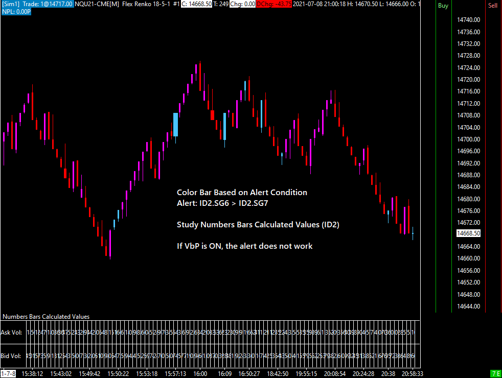 We can not think of any reason why the Color Bar Based on Alert Condition would not work when the VbP is present. We just did some tests to assure ourselves, and we did not see any issue. Please attach a Chartbook with a single chart in it showing the issue you are seeing. As to the Delta, we need to know exactly what study you are using and how you are setting the "Show Only above X Value". As to the ZigZag, we are understanding the exact scenario you are referencing. Are you saying that the wrong volume is displayed and then when you recalculate it updates to correct value? And is this for previous values, or only when a new inflection point is created? For the most reliable, advanced, and zero cost futures order routing, use the Teton service: Sierra Chart Teton Futures Order Routing |