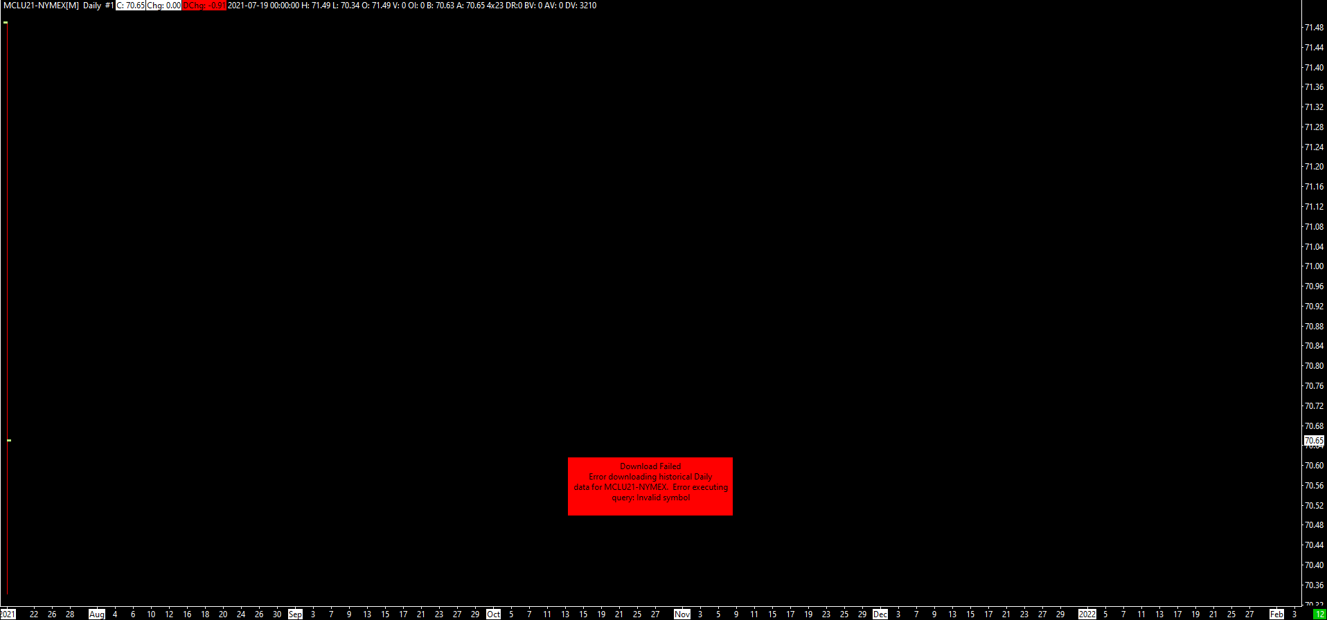 I'm unable to view a chart for the micro crude oil futures. Under file I have selected Find Symbol, MCLU21-NYMEX, and Open Historical Chart, and the chart shows one bar with the message: "Download Failed. Error downloading historical Daily data for MCLU21-NYMEX. Error executing query. Invalid symbol" How do I fix this issue? What should I do to view a historical daily chart of the micro crude oil futures? Thanks for your help. http://www.sierrachart.com/image.php?Image=1626666151905.png Date Time Of Last Edit: 2021-07-19 22:03:13