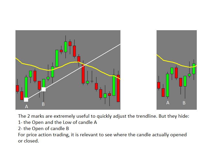 If the suggestion from the previous post is too much trouble, another option would be to add the setting 'make anchors always visible'. Anchors do not hide the price action as the marks currently do. This would go a long way to quickly adjust trendlines without getting confused as to where the anchor (or mark) actually is. Thanks!