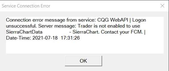 You need to contact your broker for help with getting connected to CQG to authorize the CME real-time data. For more information about the connection problem, refer to: CQG Trading Platform Service: Common Error Messages ---- The reason you are not getting real-time data from the CME Group of exchanges is that you activated the Non-Professional exchange fees, but you have not verified that you have a live, funded, futures trading account, which the CME needs in order to allow you data at the lower priced fees. Refer to the following for instructions on how to connect once a month to your *live funded* trading account to qualify for the lower-priced exchange fees: Real-Time Exchange Data Feeds Available From Sierra Chart: Connecting Only Once a Month to Trading Account to Support CME Group Exchange Fees If you do not have a funded trading account or one with a supported trading service, then refer to this solution: Easy Solution to CME Funded Trading Account Requirement We recommend using the above solution in any case to avoid this problem in the future. Sierra Chart Support - Engineering Level Your definitive source for support. Other responses are from users. Try to keep your questions brief and to the point. Be aware of support policy: https://www.sierrachart.com/index.php?l=PostingInformation.php#GeneralInformation For the most reliable, advanced, and zero cost futures order routing, *change* to the Teton service: Sierra Chart Teton Futures Order Routing |